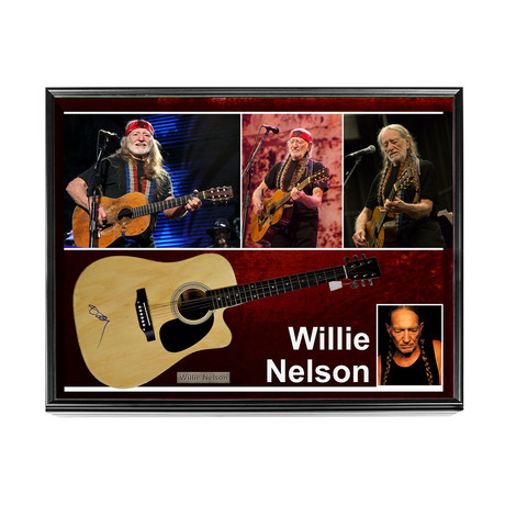 This is an incredible huge custom made display shadowbox with autographed hand signed guitar that comes certified authentic. Each display case is custom made so we can customize this to be other images or other colors, however you like. Approximate turn around time is 3 weeks on this item. This is a brand new Signature Edition acoustic guitar autographed in person by Willie Nelson and comes with video of him signing this exact guitar.