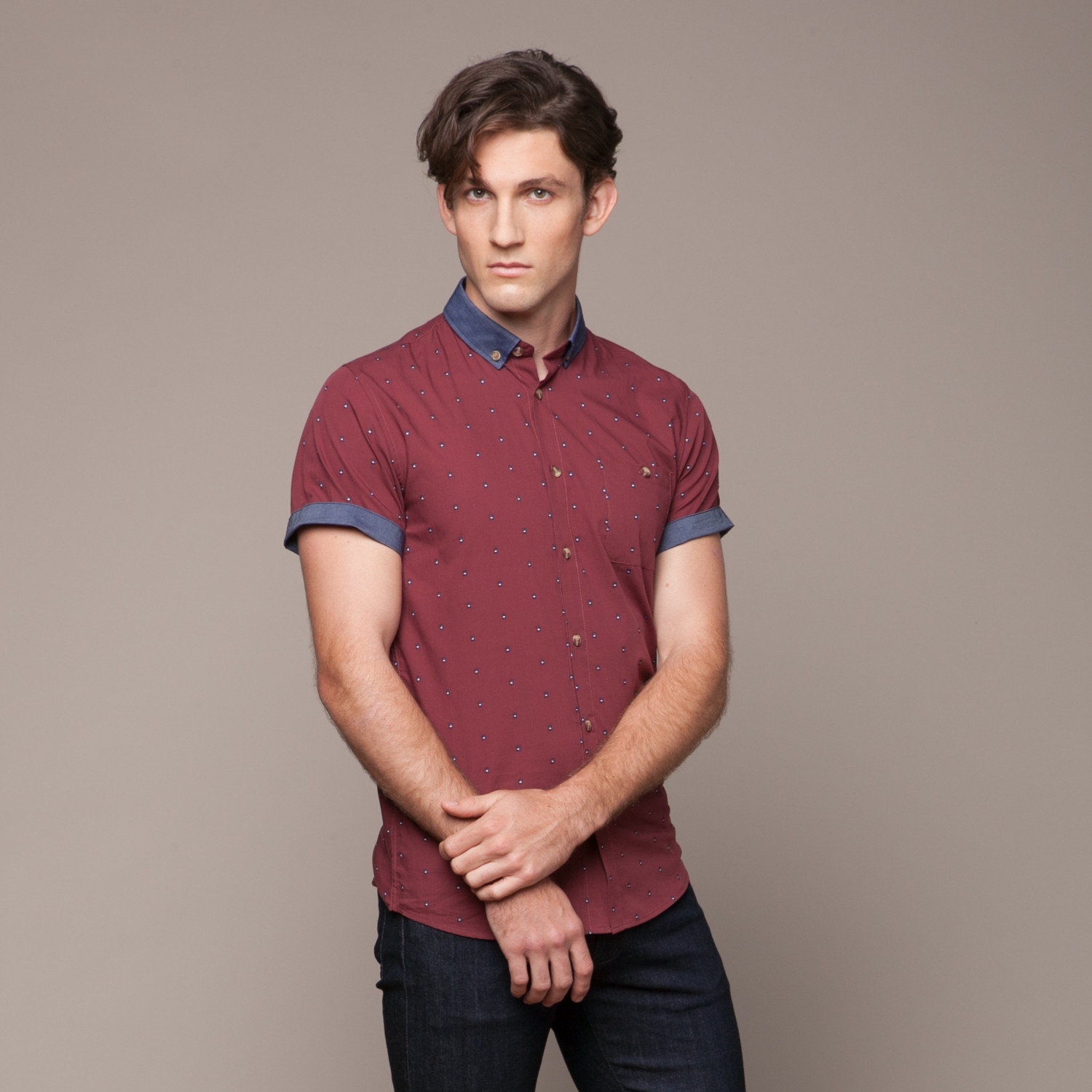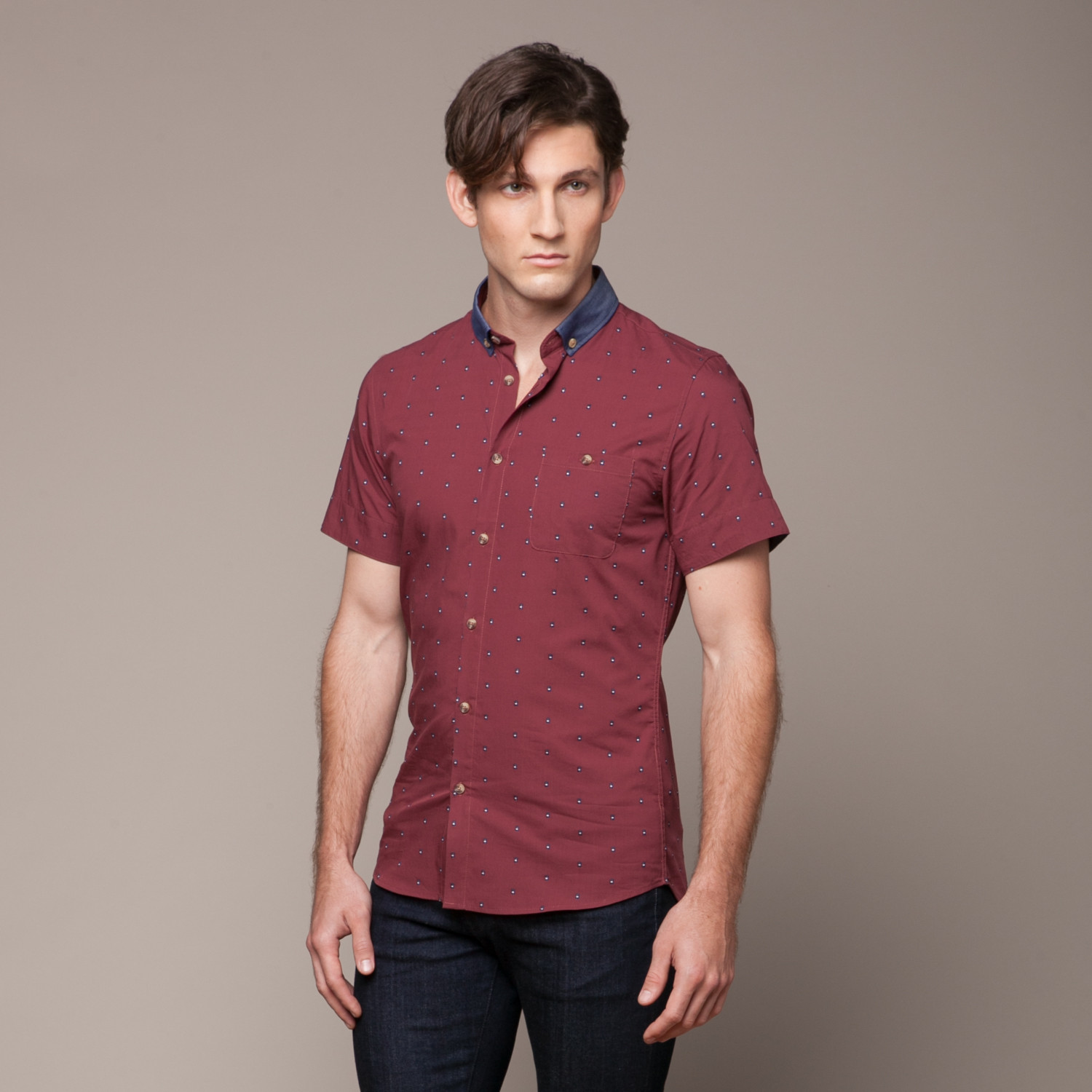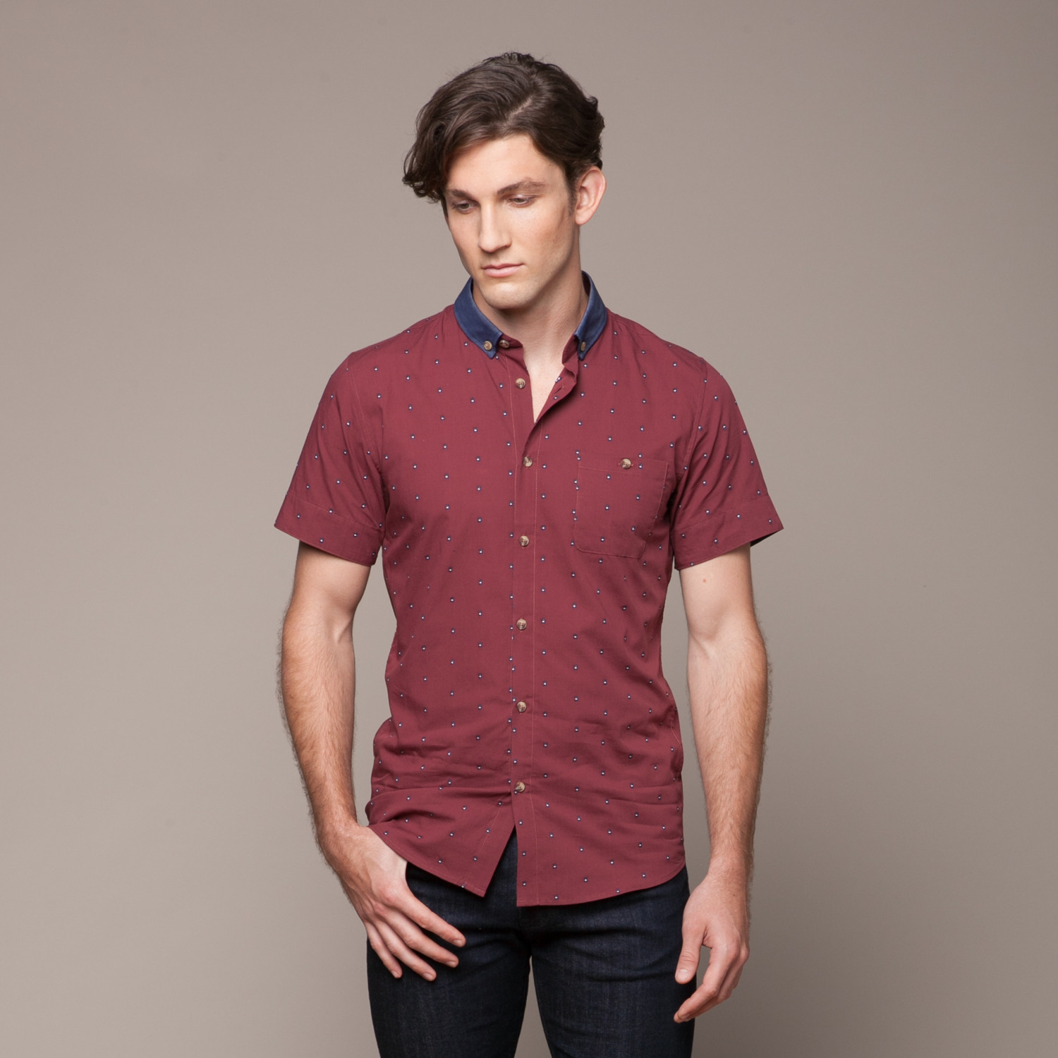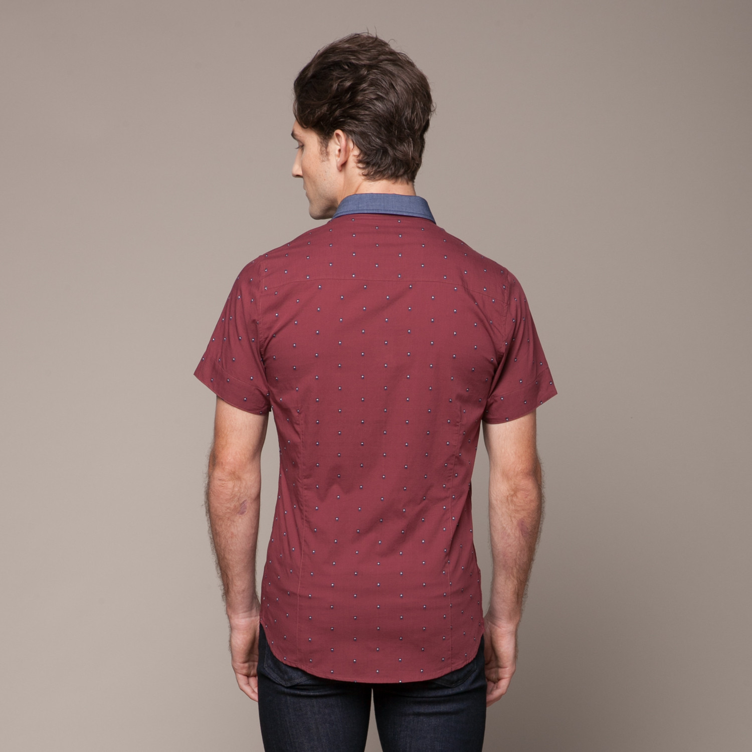 The Justin Shirt in Berry Denim is a short-sleeved button down that can be dressed up or down with ease. Made in a washed out red shirting cotton with an overall embroidered board pattern, it sports a contrast blue chambray collar, sleeve and inner placket front, as well as horn buttons. Wear it with your favorite pair of faded jeans for a laid-back look or with dark pants and a blazer for something dark and refined.