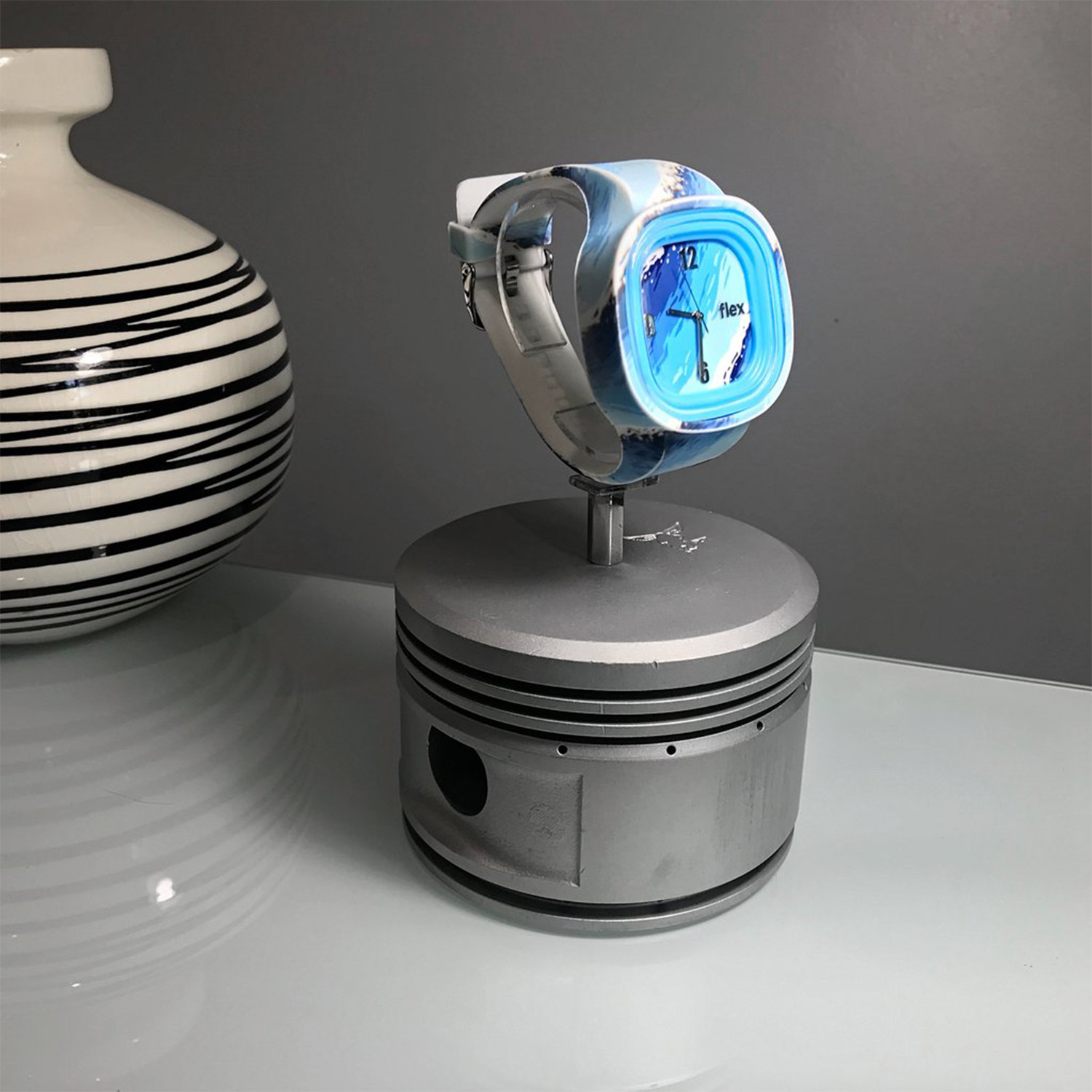 This industrial Airplane Engine Watch Stand was created using a 1950's Continental Motors 0-200 (also called the C90) airplane engine piston. The 0-200 engines are used in many aircraft designs in the United States, including the early Piper PA-18 Super Cub, the Champion 7EC, the Alon Aircoupe, and the Cessna 150. Blasted to raw aluminum, this Flying Monkey Edition comes complete with a watch stand and adapter. All you need is your favorite watch to show off.