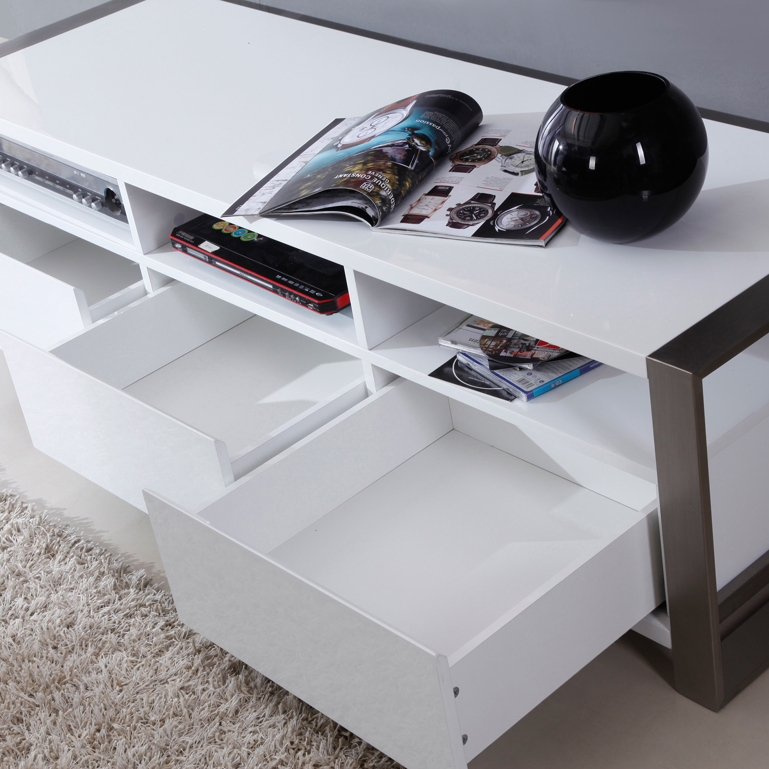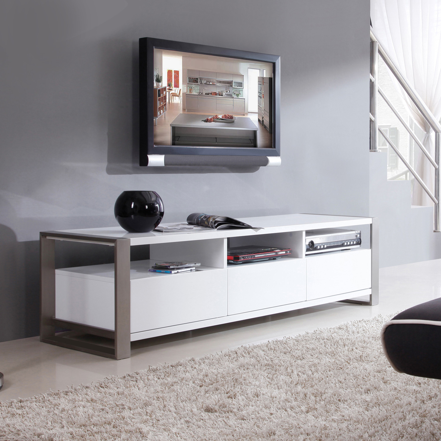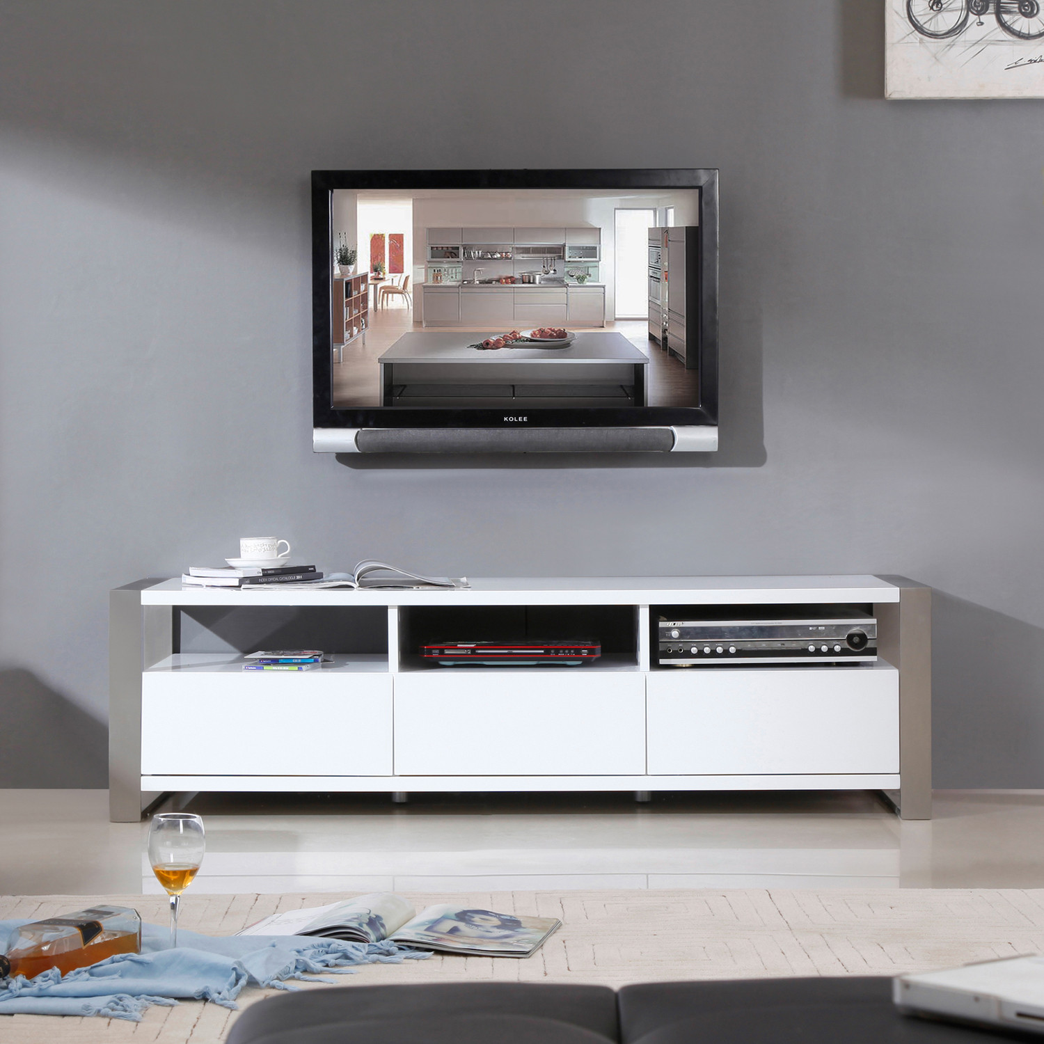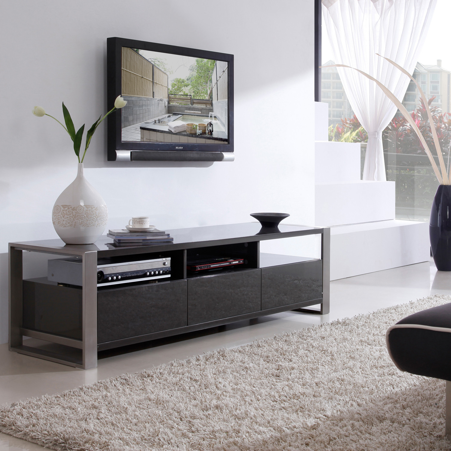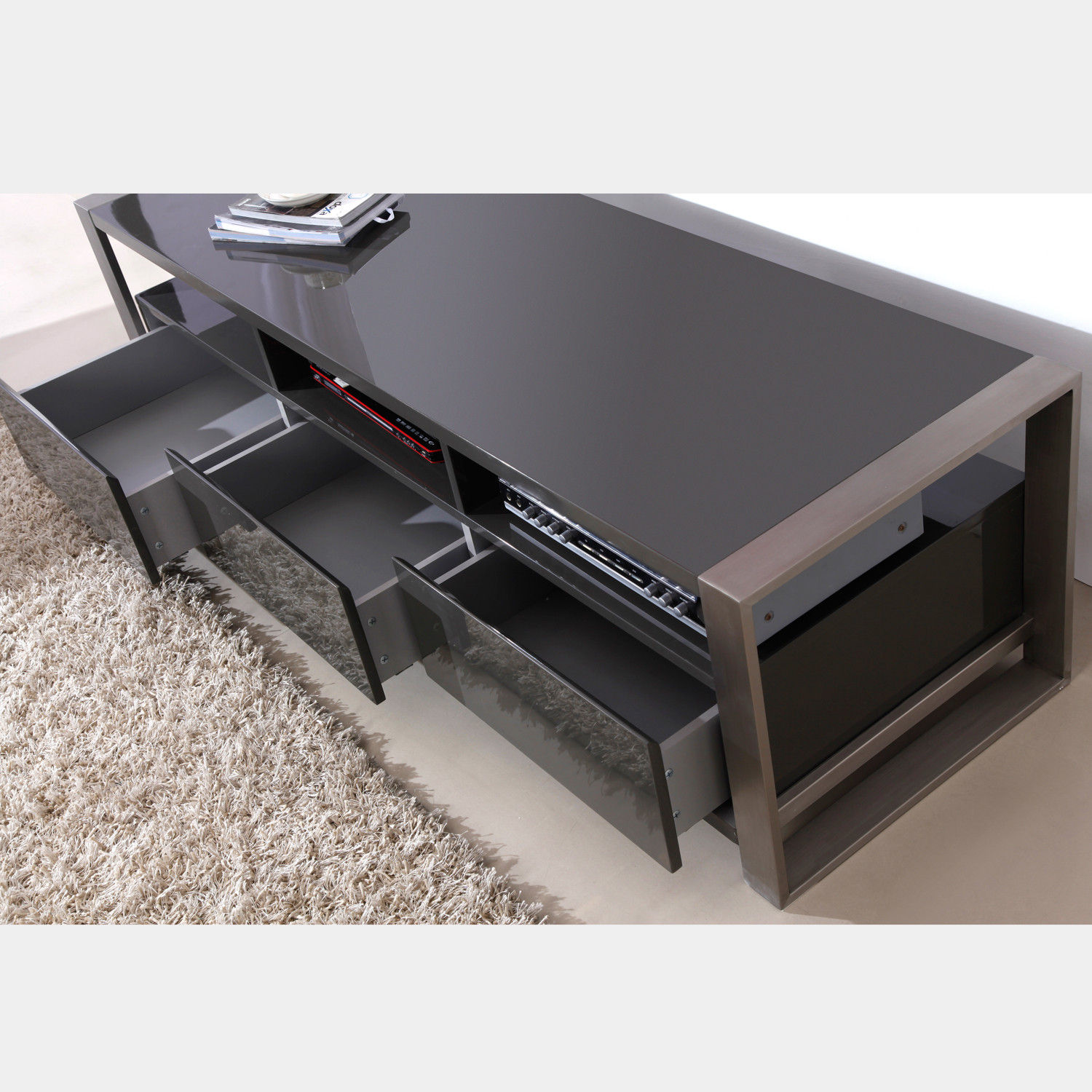 Function and form come together to create the perfect entertainment center in this stainless steel TV stand. It features 3 media drawers with state-of-the-art slow closing technology and exclusive, commercial grade, brushed stainless steel legs. For the maximum use of a small space, the Stylist has 3 convenient component shelves with easy wiring access. The Stylist’s trend-setting, gray high gloss finish puts this design in a class of its own.