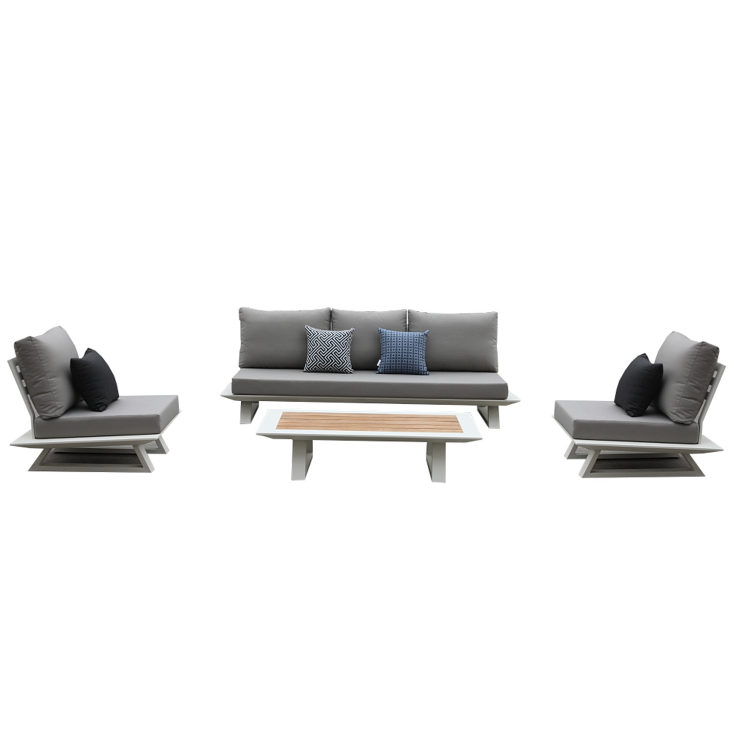 — This sofa set includes (2) LUXE armless club chairs, (1) LUXE 3 seater sofa, and (1) LUXE square coffee table with a teak style top.