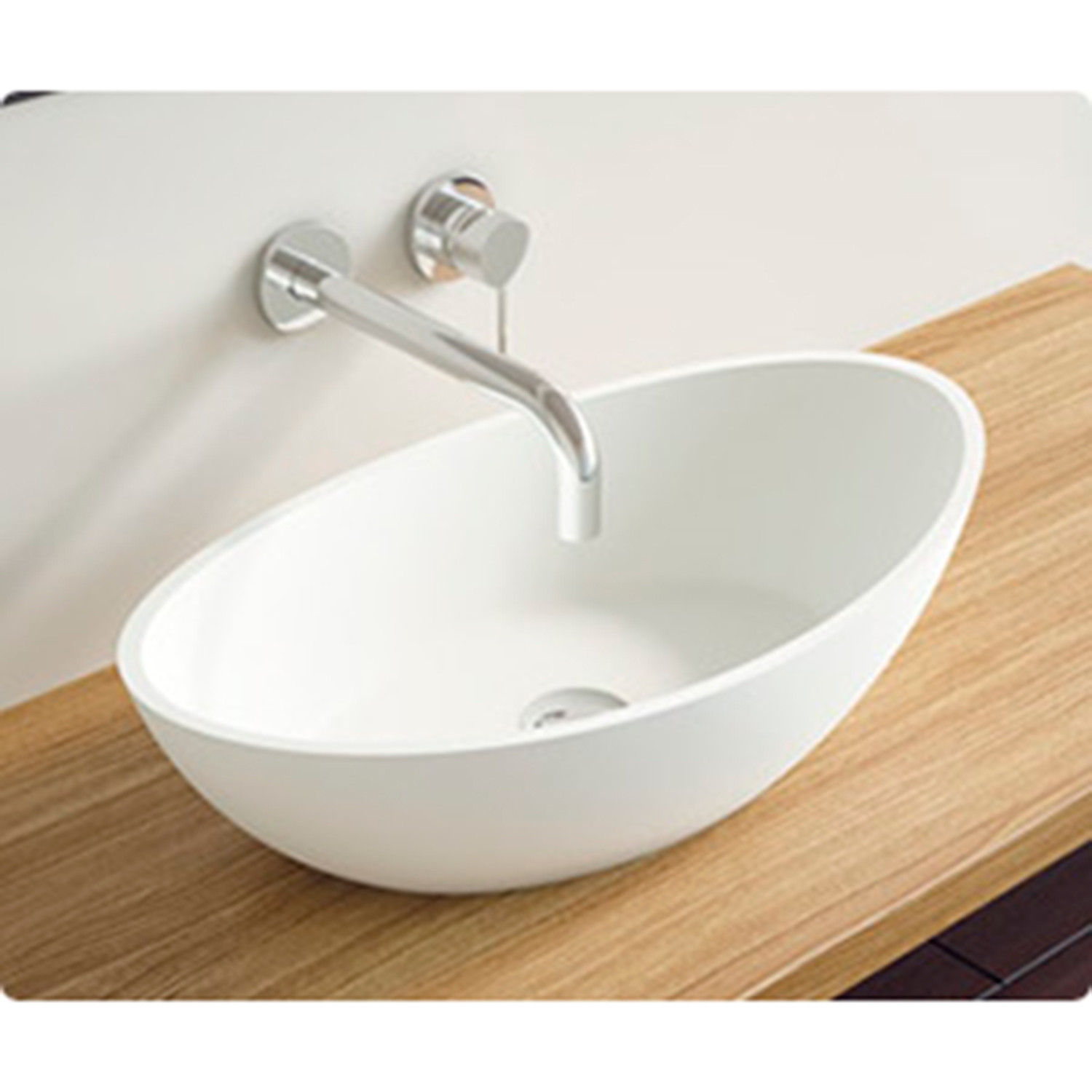 This special collection of bathroom sinks by Badeloft® is uniquely crafted from Stone Resin. Stone Resin is a composite material made by crushing white stone, and binding it with a smooth polymer resin. This makes for a sleek and unusual shade of white, and an interesting texture up close. It's also eco-friendly, non-porous, and absurdly heat resistant.