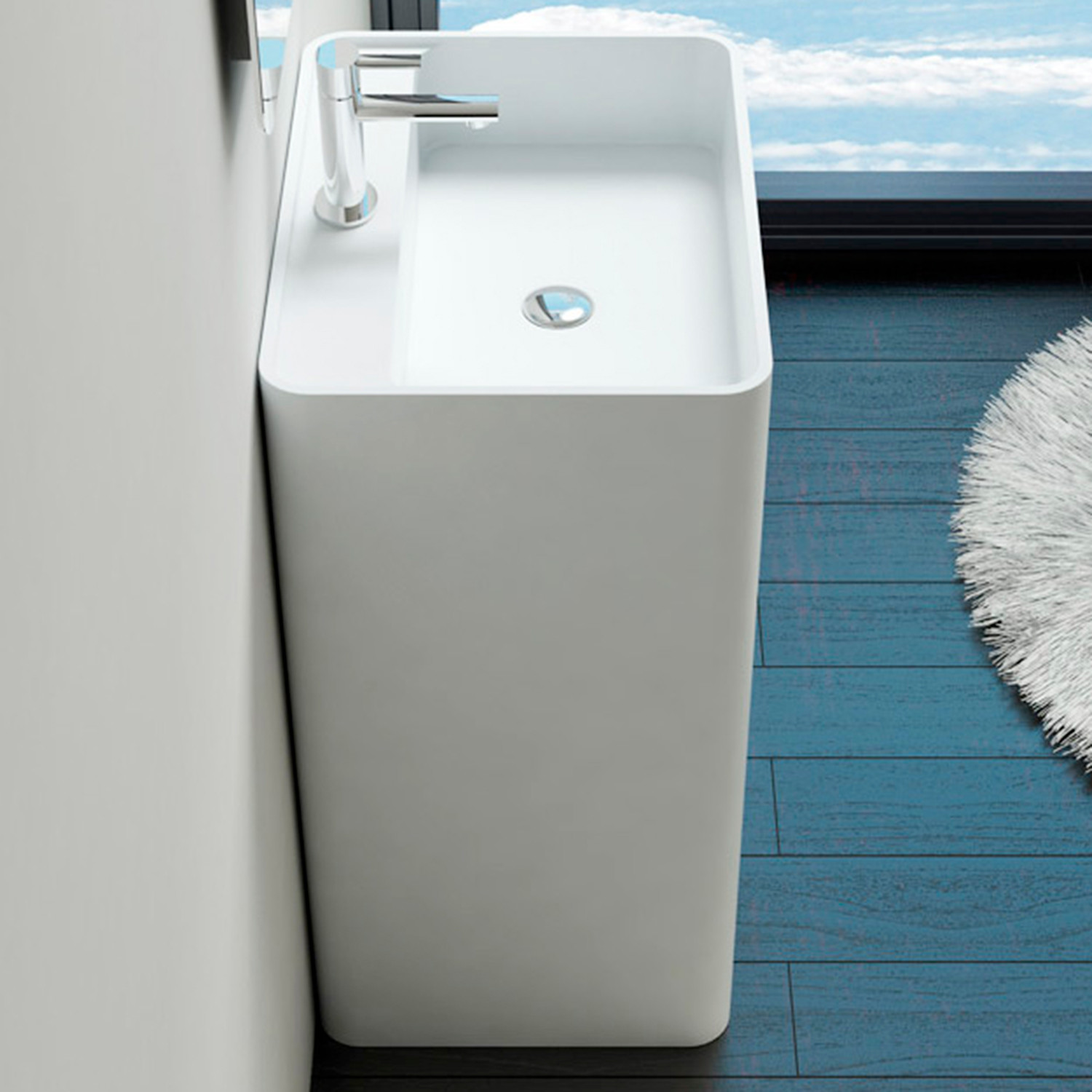 Striking in its simplicity, the SB-02-A solid surface freestanding sink epitomizes traditional craftsmanship and sleek modern elegance for a mesmerizing focal point to your bath. The majestic character of this stone resin sink is met with clean lines and gentle curves for an indulgent luxury design that blends beautifully with your contemporary bathroom. The understated look is classic elegance that is quality and beauty at its finest. The sleek white exterior emphasizes the modern style with curves that invite touch. Treat yourself to classic luxury and indulge in the organic design and attractive lines of this rectangular sink. This stunning upscale design is elegance at your fingertips.