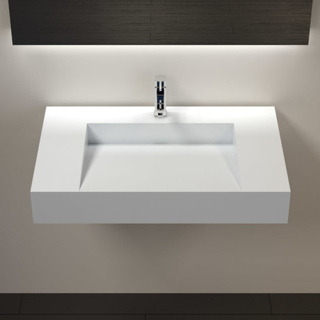 This special collection of bathroom sinks by Badeloft® is uniquely crafted from Stone Resin. Stone Resin is a composite material made by crushing white stone, and binding it with a smooth polymer resin. This makes for a sleek and unusual shade of white, and an interesting texture up close. It's also eco-friendly, non-porous, and absurdly heat resistant.
