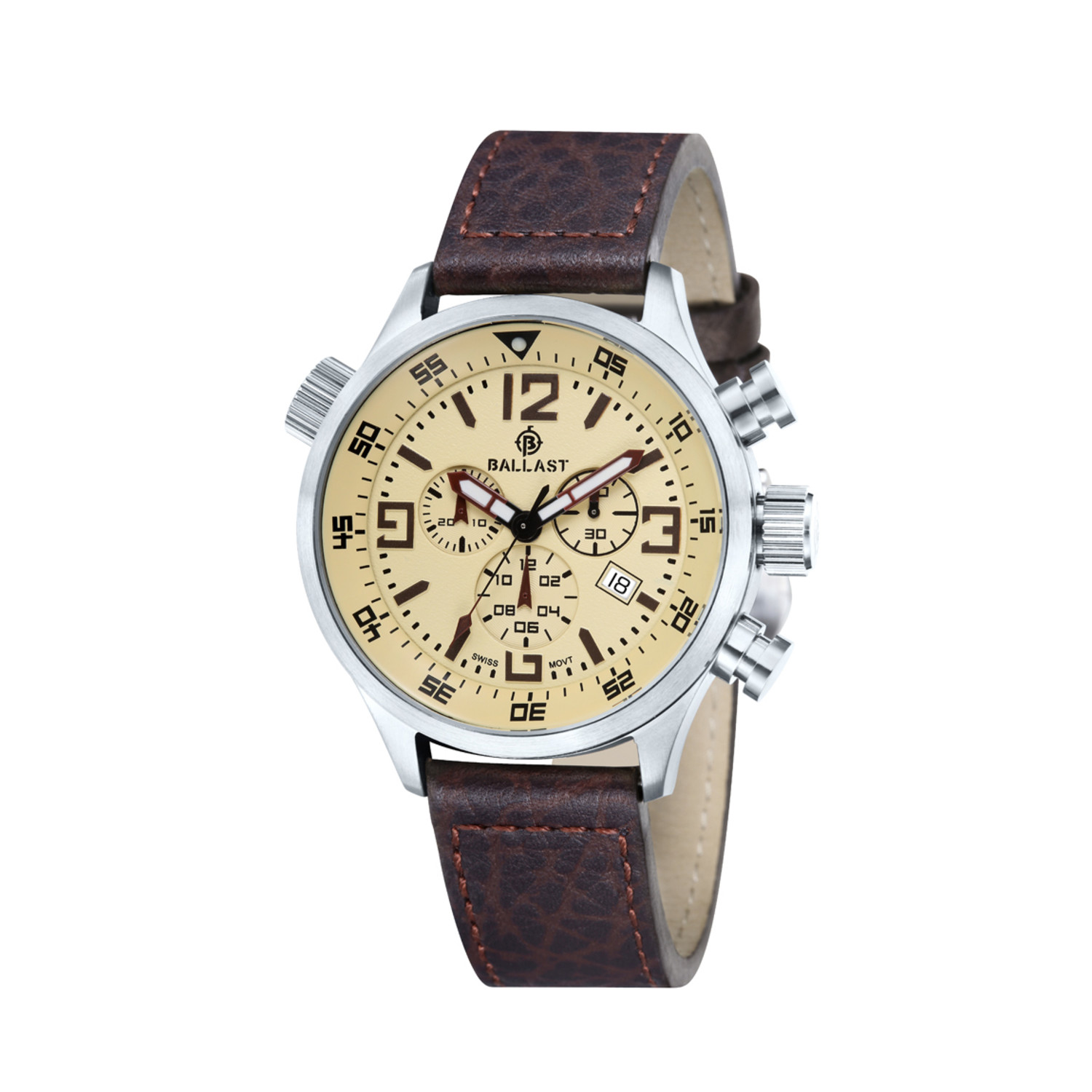 Combine style and function with this Ballast watch, featuring a bold face and beautiful detailing wrapped up in stainless steel and luxurious quality buffalo leather with heavy duty stitching. This Swiss made quartz watch with date has a durable mineral crystal dial window protecting watch from scratches, and a resistant stainless steel case to complete the look.