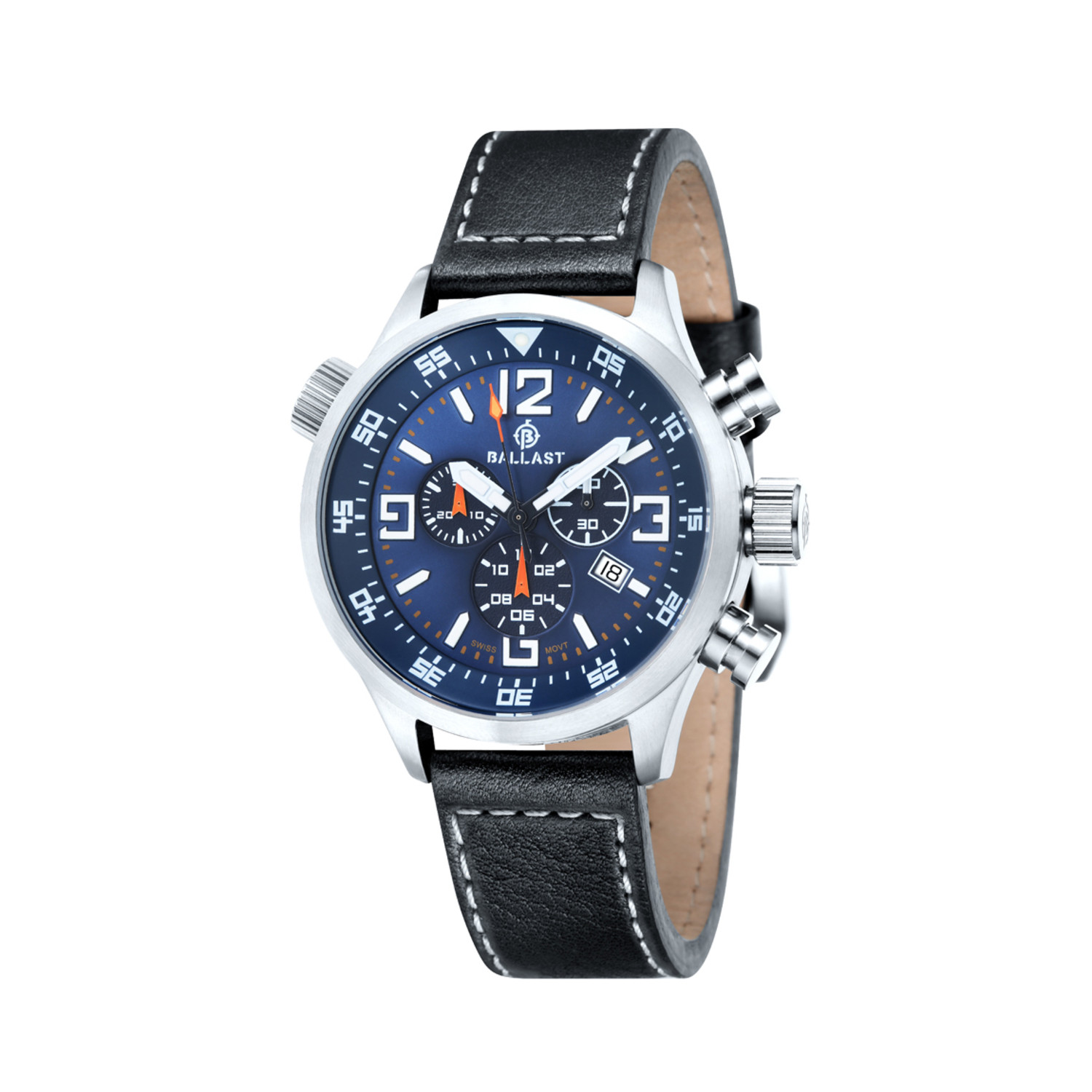 Combine style and function with this Ballast watch, featuring a bold face and beautiful detailing wrapped up in stainless steel and luxurious quality buffalo leather with heavy duty stitching. This Swiss made quartz watch with date has a durable mineral crystal dial window protecting watch from scratches, and a resistant stainless steel case to complete the look.