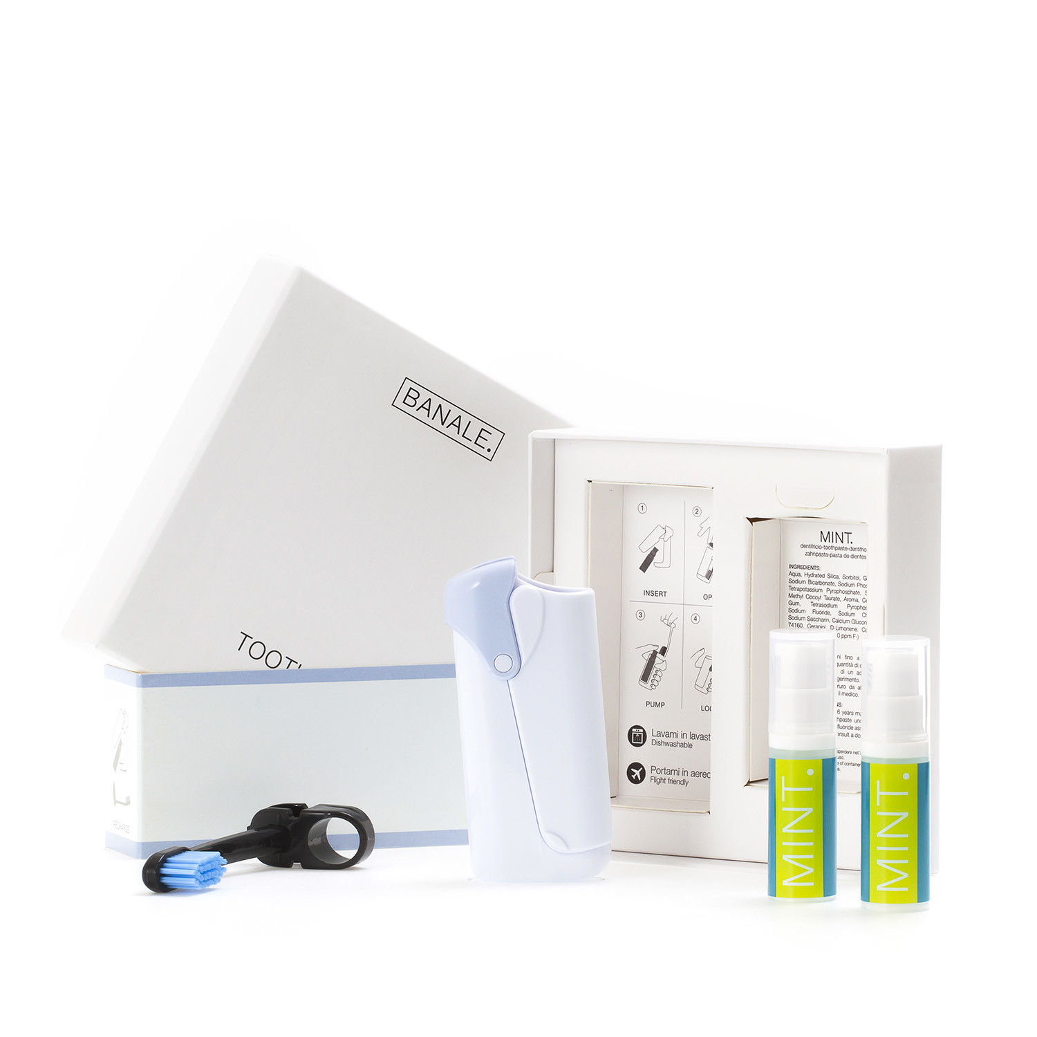 A mini pump of mint toothpaste is integrated into the body of the toothbrush. It's easy to use and manufactured with a special airless technology that prevents the toothpaste from drying out. Each mini pump contains 50 doses of toothpaste, each one minty and perfect for keeping your mouth clean.
