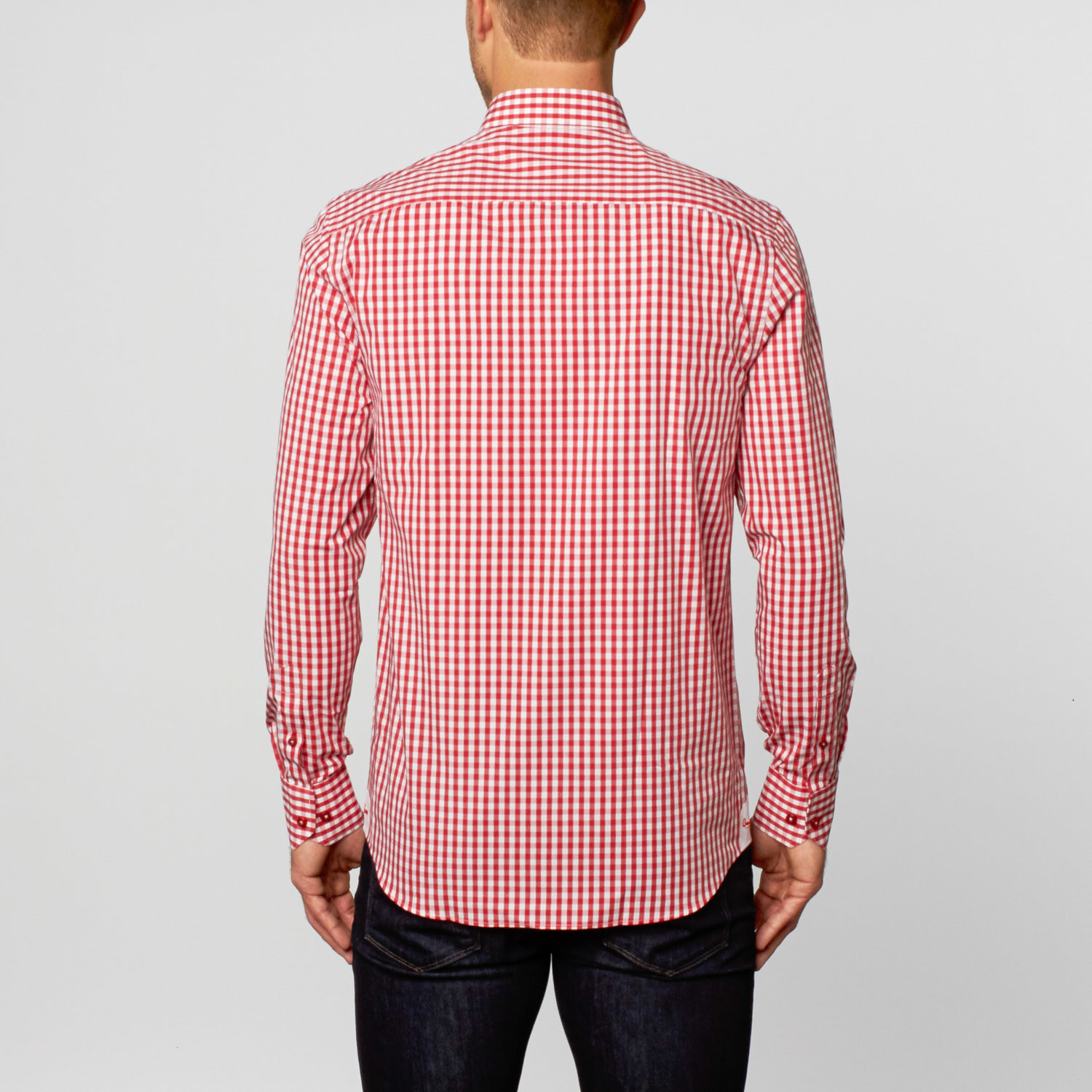 Cement your status as a true tastemaker with this bold button-up. With its flaunt-worthy contrast trimming and unusual button placement, this shirt makes the transition from work to play with utter aplomb.