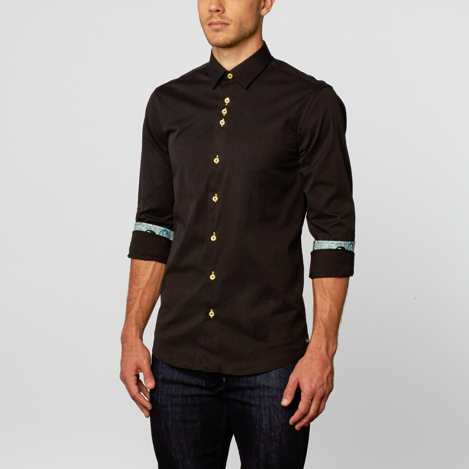 Cement your status as a true tastemaker with this bold button-up. With its flaunt-worthy contrast trimming and unusual button placement, this shirt makes the transition from work to play with utter aplomb.