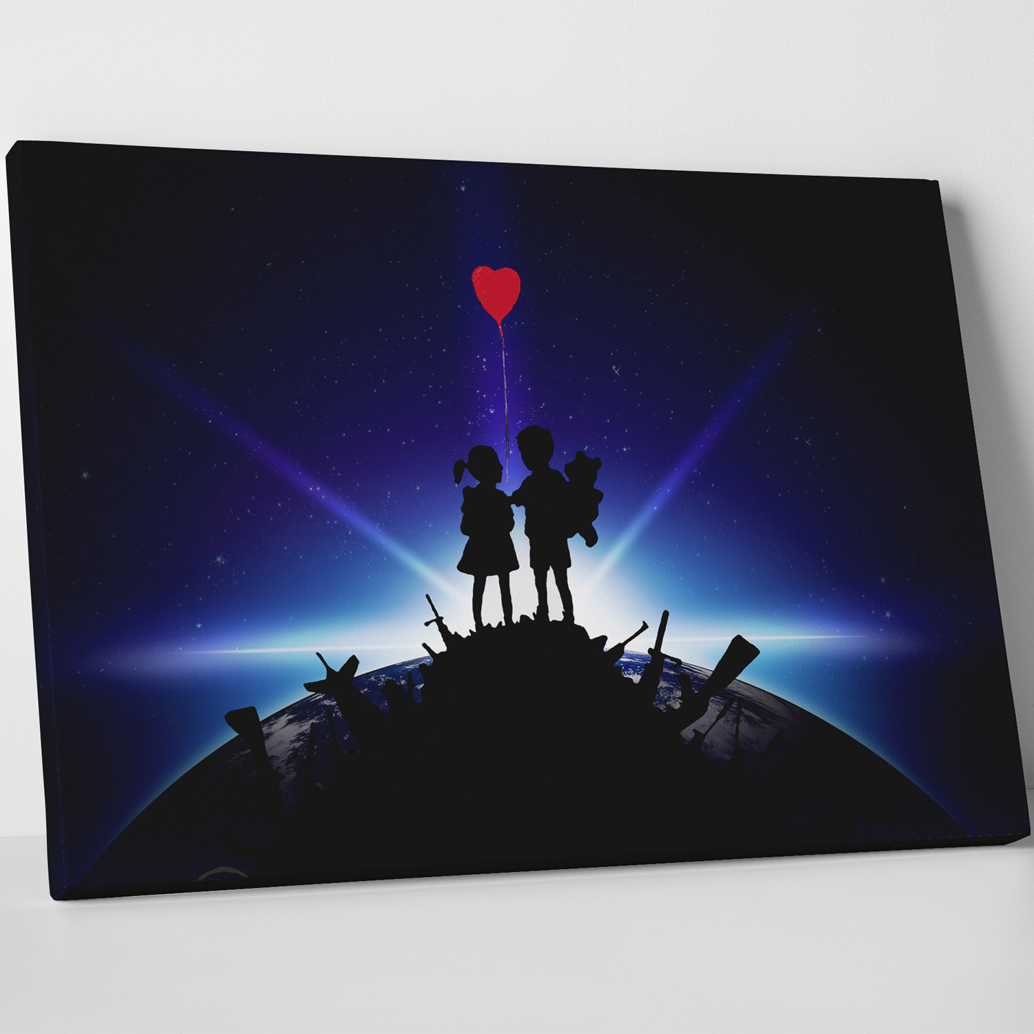This museum grade canvas print features one of Banksy's ever-stirring images from his socially and politically-minded oeuvre. Classified as a vandal by some and a hero by others, Banksy has nevertheless managed to prod, excite, and entertain us all. Own this provocative canvas today for an easy-to-hang piece that needs no frame and no explanation.