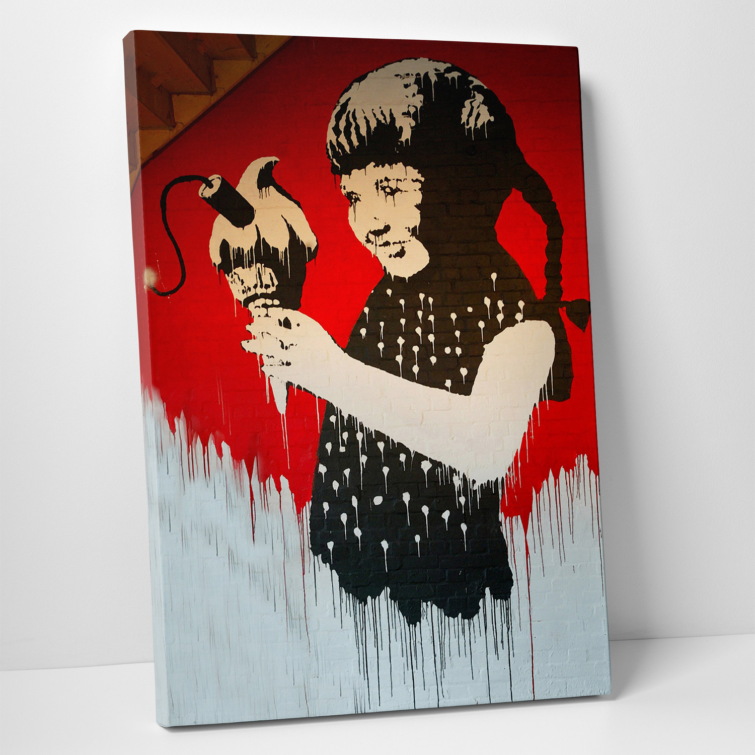 This museum grade canvas print features one of Banksy's ever-stirring images from his socially and politically-minded oeuvre. Classified as a vandal by some and a hero by others, Banksy has nevertheless managed to prod, excite, and entertain us all. Own this provocative canvas today for an easy-to-hang piece that needs no frame and no explanation.