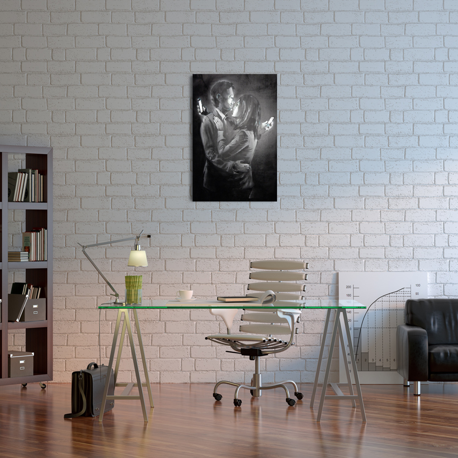 Aluminum is a perfectly smooth surface that reflects the images in high contrast with vibrant colors that pop in striking hi-res detail. These Banksy images are infused into the aluminum and specially coated, making them ultra UV resistant, difficult to scratch, and waterproof. This provides your image with added depth and dimension for a modern look which is finished by its edge-to-edge prints, routed edges and safe corners.The modern and clean look of metal serves as the perfect medium for Banksy's visionary artwork.
