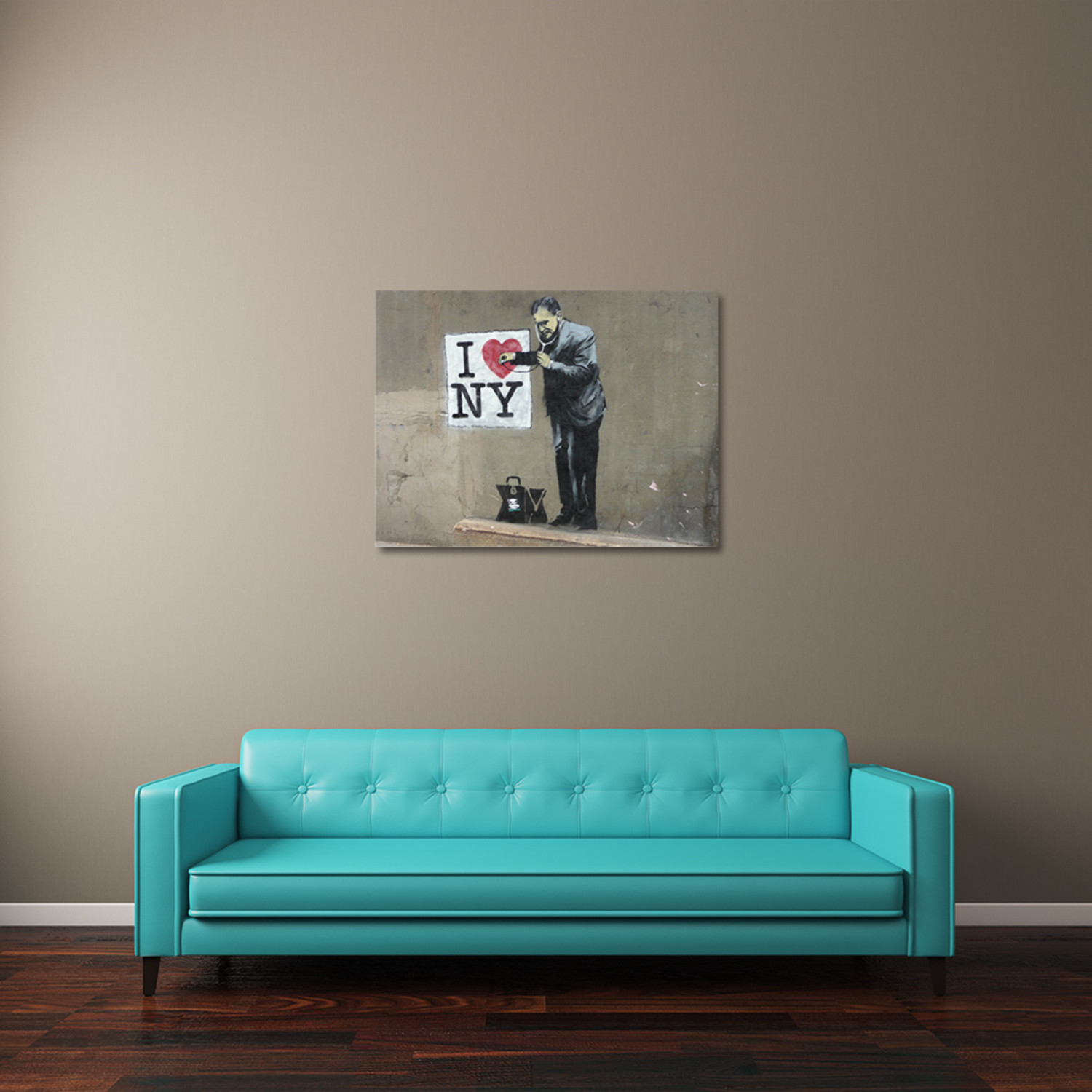 Aluminum is a perfectly smooth surface that reflects the images in high contrast with vibrant colors that pop in striking hi-res detail. These Banksy images are infused into the aluminum and specially coated, making them ultra UV resistant, difficult to scratch, and waterproof. This provides your image with added depth and dimension for a modern look which is finished by its edge-to-edge prints, routed edges and safe corners.The modern and clean look of metal serves as the perfect medium for Banksy's visionary artwork.