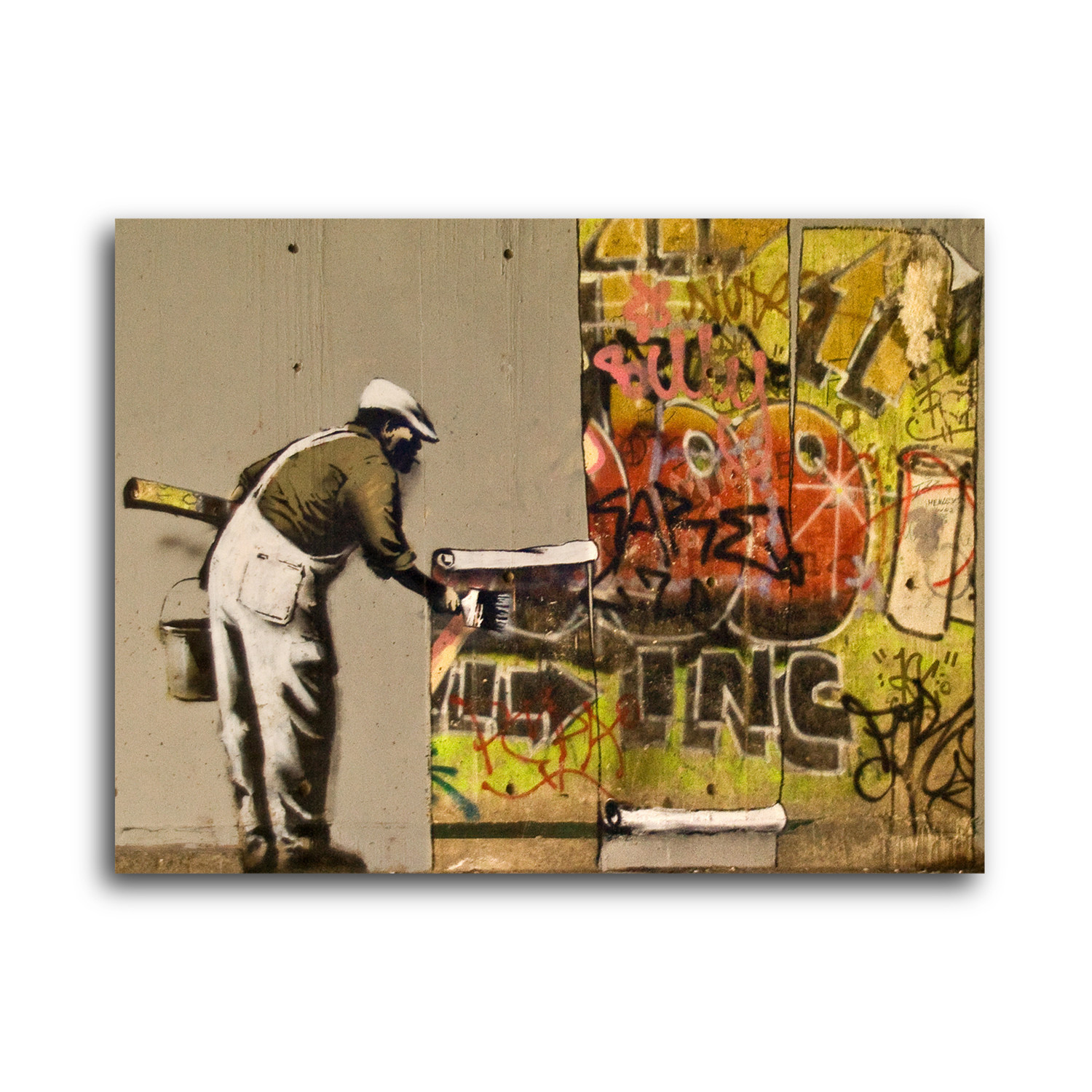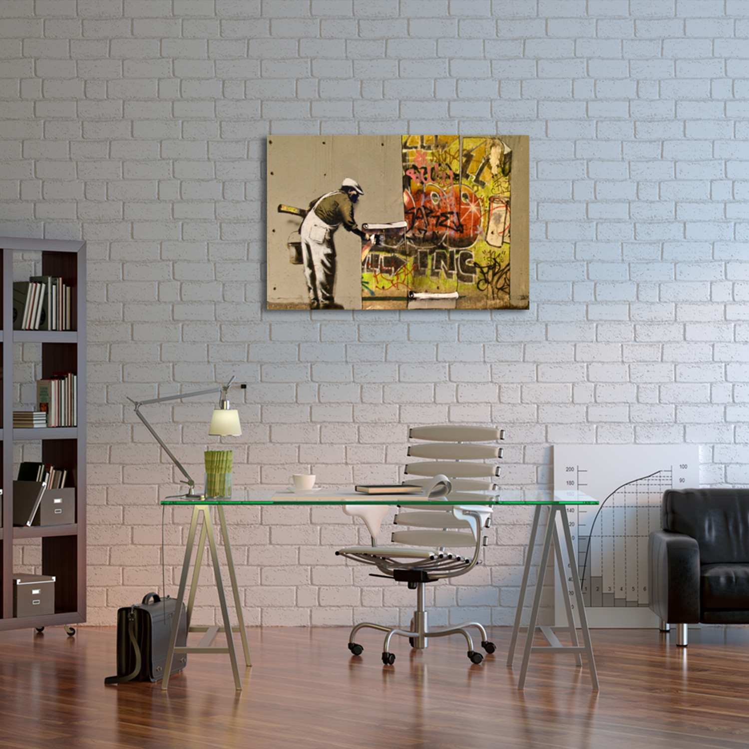Aluminum is a perfectly smooth surface that reflects the images in high contrast with vibrant colors that pop in striking hi-res detail. These Banksy images are infused into the aluminum and specially coated, making them ultra UV resistant, difficult to scratch, and waterproof. This provides your image with added depth and dimension for a modern look which is finished by its edge-to-edge prints, routed edges and safe corners.The modern and clean look of metal serves as the perfect medium for Banksy's visionary artwork.