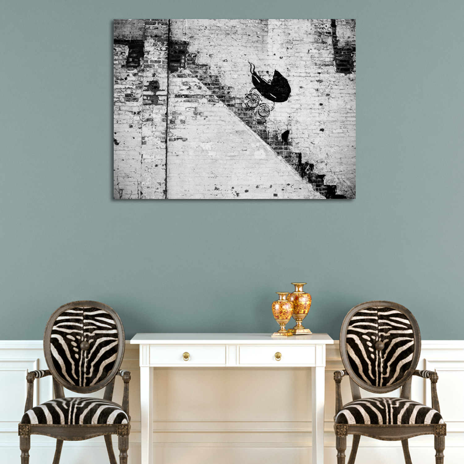 Aluminum is a perfectly smooth surface that reflects the images in high contrast with vibrant colors that pop in striking hi-res detail. These Banksy images are infused into the aluminum and specially coated, making them ultra UV resistant, difficult to scratch, and waterproof. This provides your image with added depth and dimension for a modern look which is finished by its edge-to-edge prints, routed edges and safe corners.The modern and clean look of metal serves as the perfect medium for Banksy's visionary artwork.