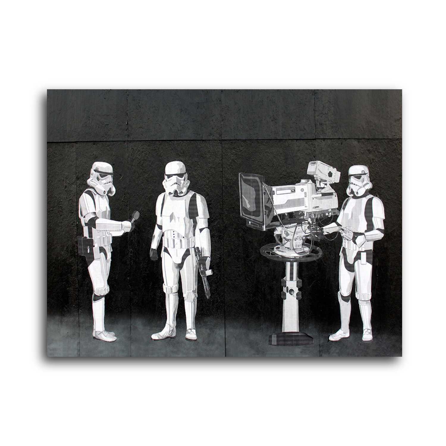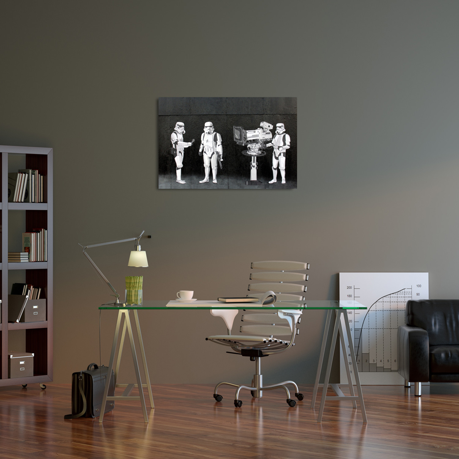 Aluminum is a perfectly smooth surface that reflects the images in high contrast with vibrant colors that pop in striking hi-res detail. These Banksy images are infused into the aluminum and specially coated, making them ultra UV resistant, difficult to scratch, and waterproof. This provides your image with added depth and dimension for a modern look which is finished by its edge-to-edge prints, routed edges and safe corners.The modern and clean look of metal serves as the perfect medium for Banksy's visionary artwork.