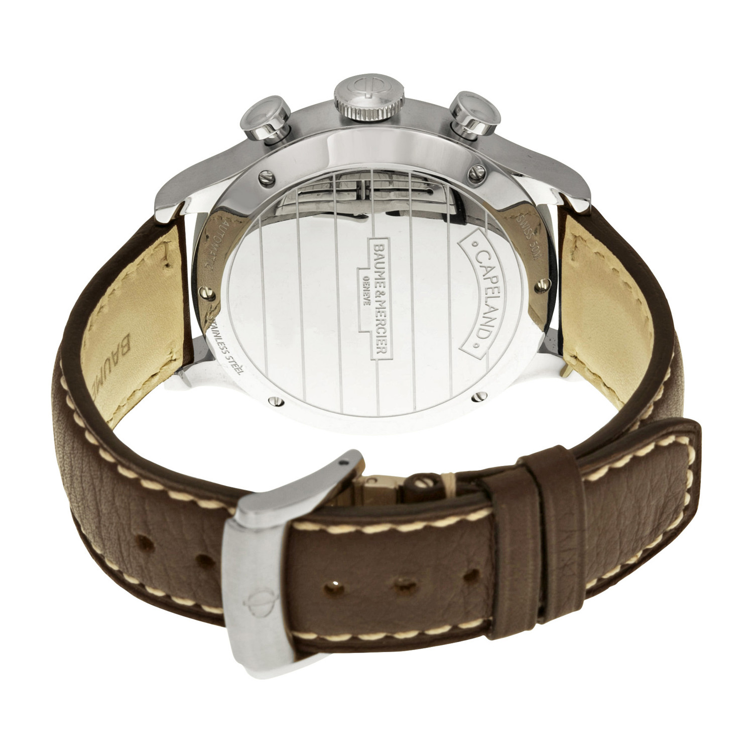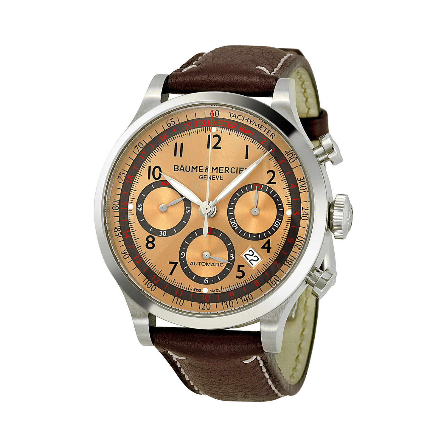 Stainless steel case with a brown leather strap. Fixed stainless steel bezel. Copper dial with luminous hands and Arabic numeral hour markers. Minute markers. Telemeter markings. Tachymeter scale appears around the outer rim. Dial Type: Analog. Luminescent hands. Date display between 4 and 5 o'clock position. Chronograph - three sub-dials displaying: 60 second, 30 minute and 12 hour. Automatic movement with a 48 hour power reserve. Scratch resistant sapphire crystal. Pull / push crown. Solid case back. Case diameter: 42 mm. Case thickness: 15 mm. Round case shape. Band width: 17 mm / 20 mm. Band length: 9.25 inches. Deployment with push button clasp. Water resistant at 50 meters / 165 feet. Functions: chronograph, hour, minute, second. Dress watch style. Watch label: Swiss Made. Item Variations: MOA10004, M0A10004, 10004. Baume and Mercier Capeland Copper Dial Automatic Chronograph Mens Watch M0A10004.