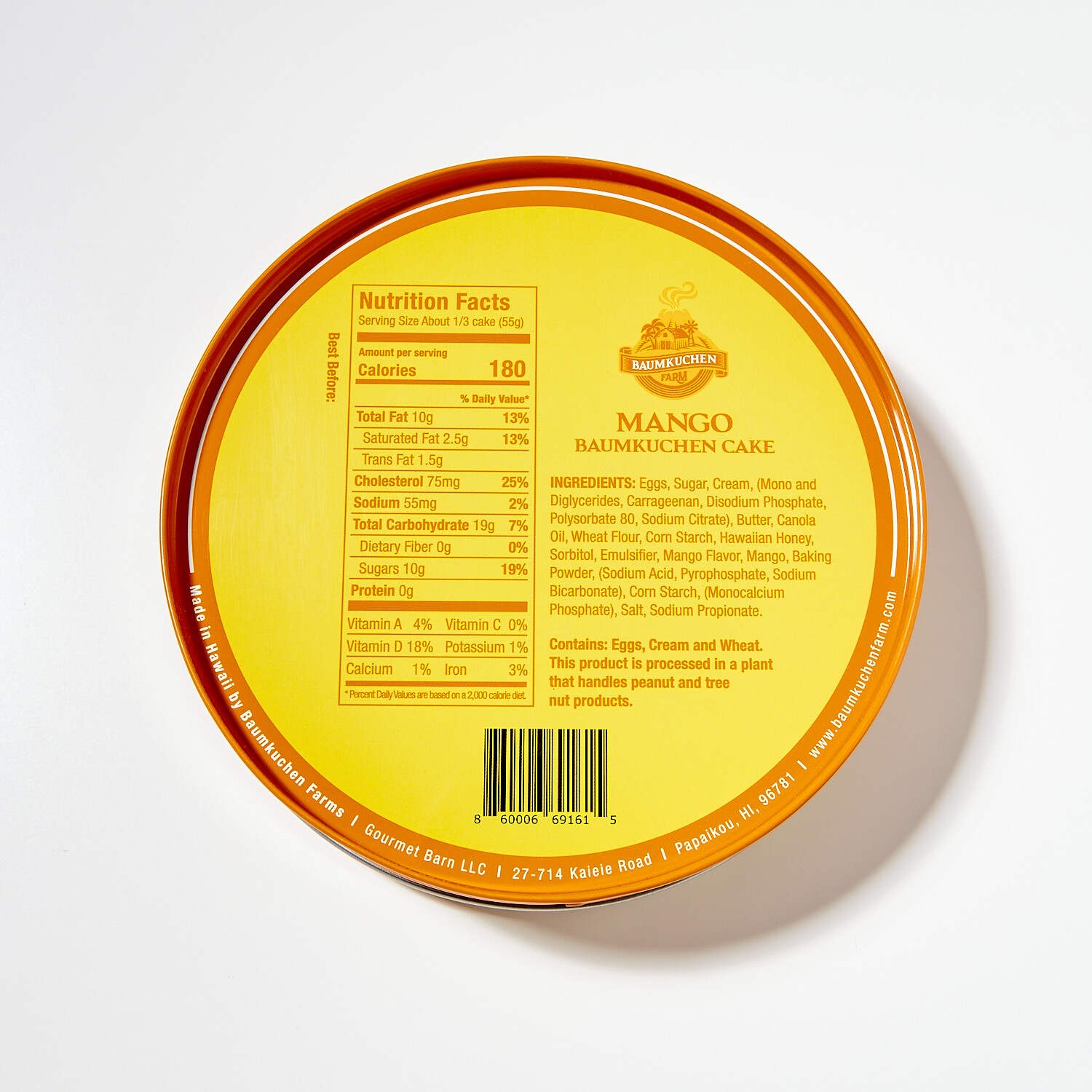 — Mango: Eggs, Sugar, Cream (Mono and Diglycerides, Carrageenan, Disodium Phosphate, Polysorbate 80, Sodium Citrate), Butter, Canola Oil, Unbleached Wheat Flour, Corn Starch, Sorbitol, Hawaiian Honey, Emulsifier, Mango, Mango Flavor, Baking Powder (Sodium Acid Pyrophosphate, Sodium Bicarbonate, Corn Starch, Monocalcium Phosphate), Salt, Sodium Propionate