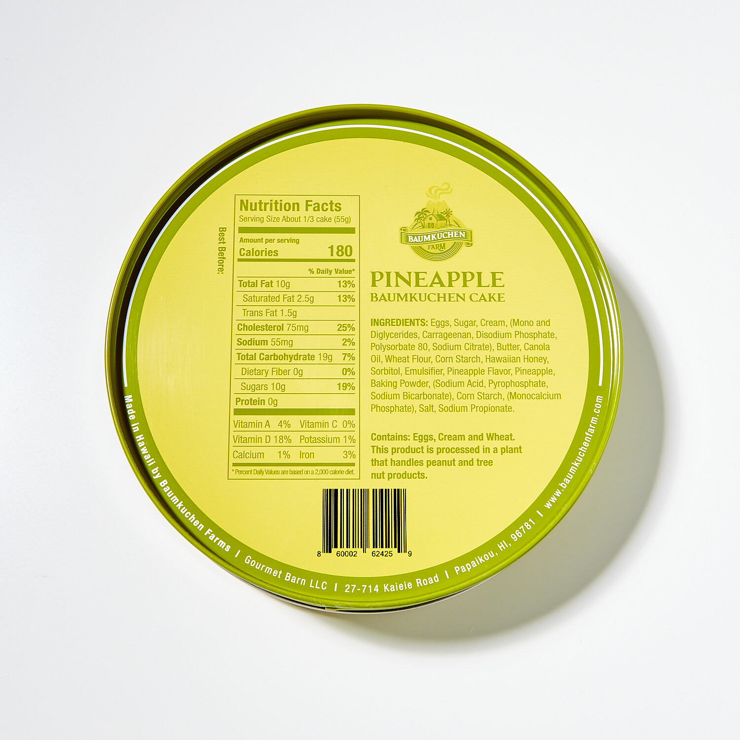 — Pineapple: Eggs, Sugar, Cream (Mono and Diglycerides, Carrageenan, Disodium Phosphate, Polysorbate 80, Sodium Citrate), Butter, Canola Oil, Unbleached Wheat Flour, Corn Starch, Sorbitol, Hawaiian Honey, Pineapples, Pineapple Flavor, Emulsifier, Baking Powder (Sodium Acid Pyrophosphate, Sodium Bicarbonate, Corn Starch, Monocalcium Phosphate), Salt, Sodium Propionate