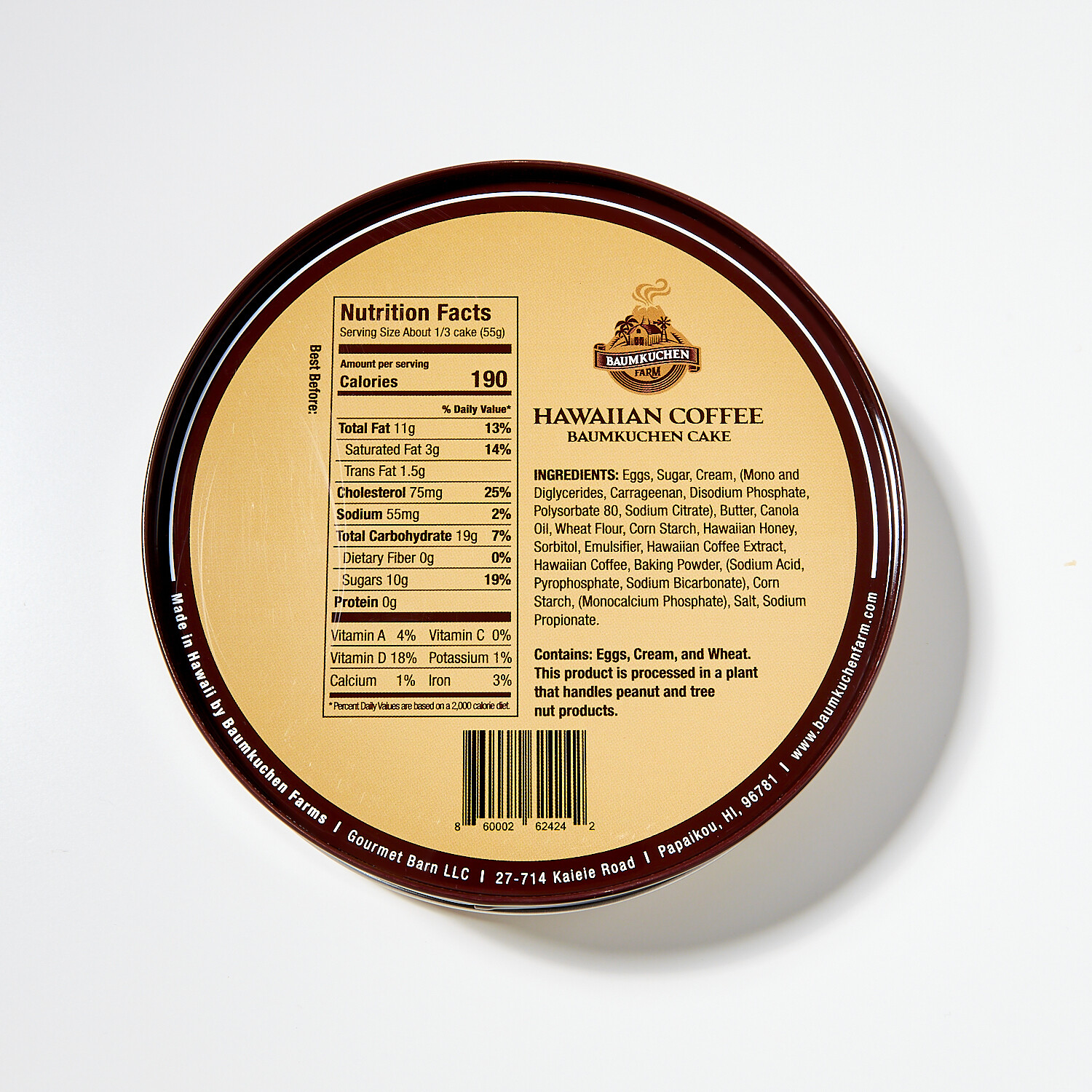 — Coffee: Eggs, Sugar, Cream (Mono and Diglycerides, Carrageenan, Disodium Phosphate, Polysorbate 80, Sodium Citrate), Butter, Canola Oil, Unbleached Wheat Flour, Corn Starch, Sorbitol, Hawaiian Honey, Hawaiian Coffee Extract, Hawaiian Coffee, Emulsifier, Baking Powder (Sodium Acid Pyrophosphate, Sodium Bicarbonate, Corn Starch, Monocalcium Phosphate), Salt, Sodium Propionate