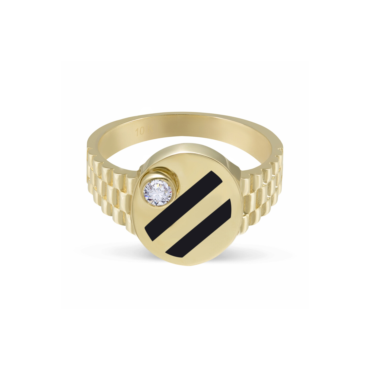 Solid 10k Yellow Gold Oval + Black Enamel CZ + Railroad Sides Ring // Size 10.5