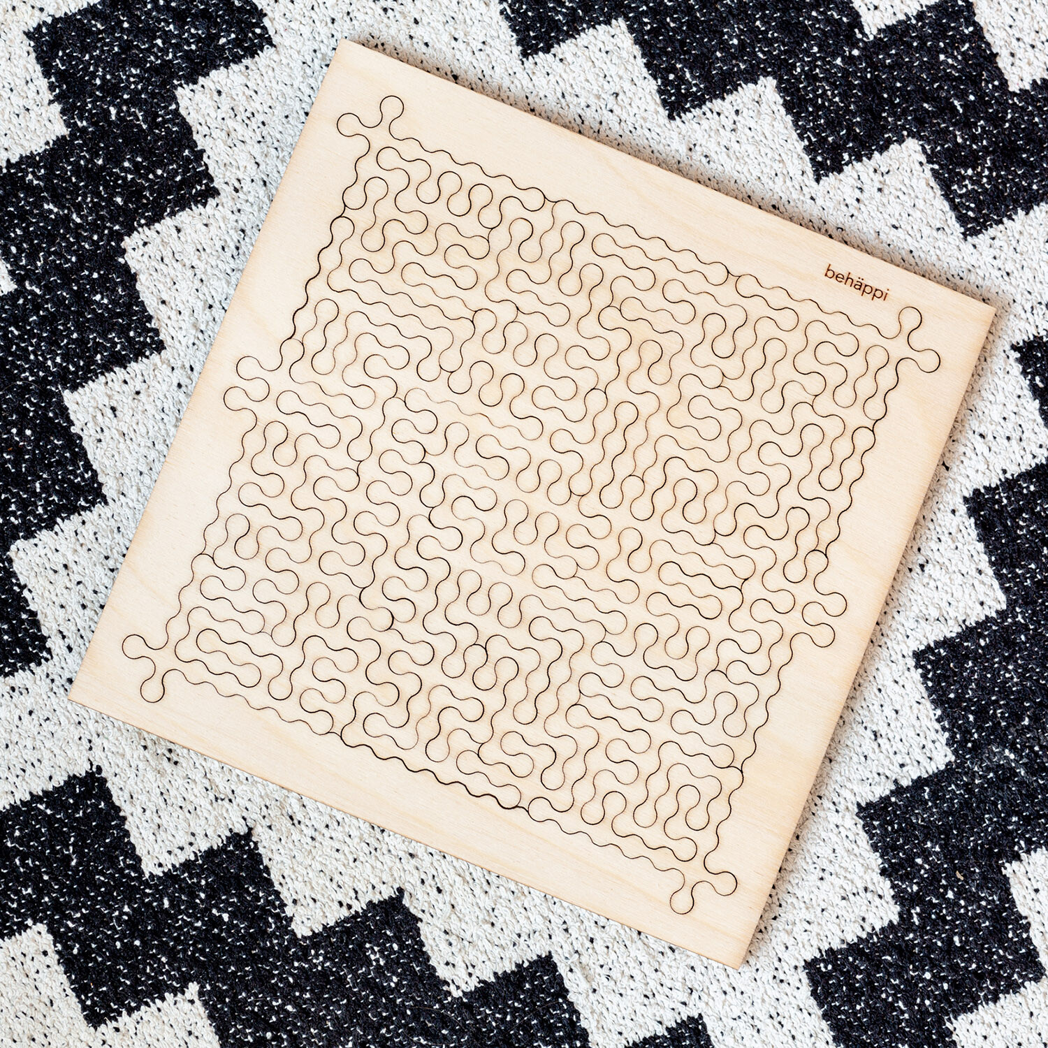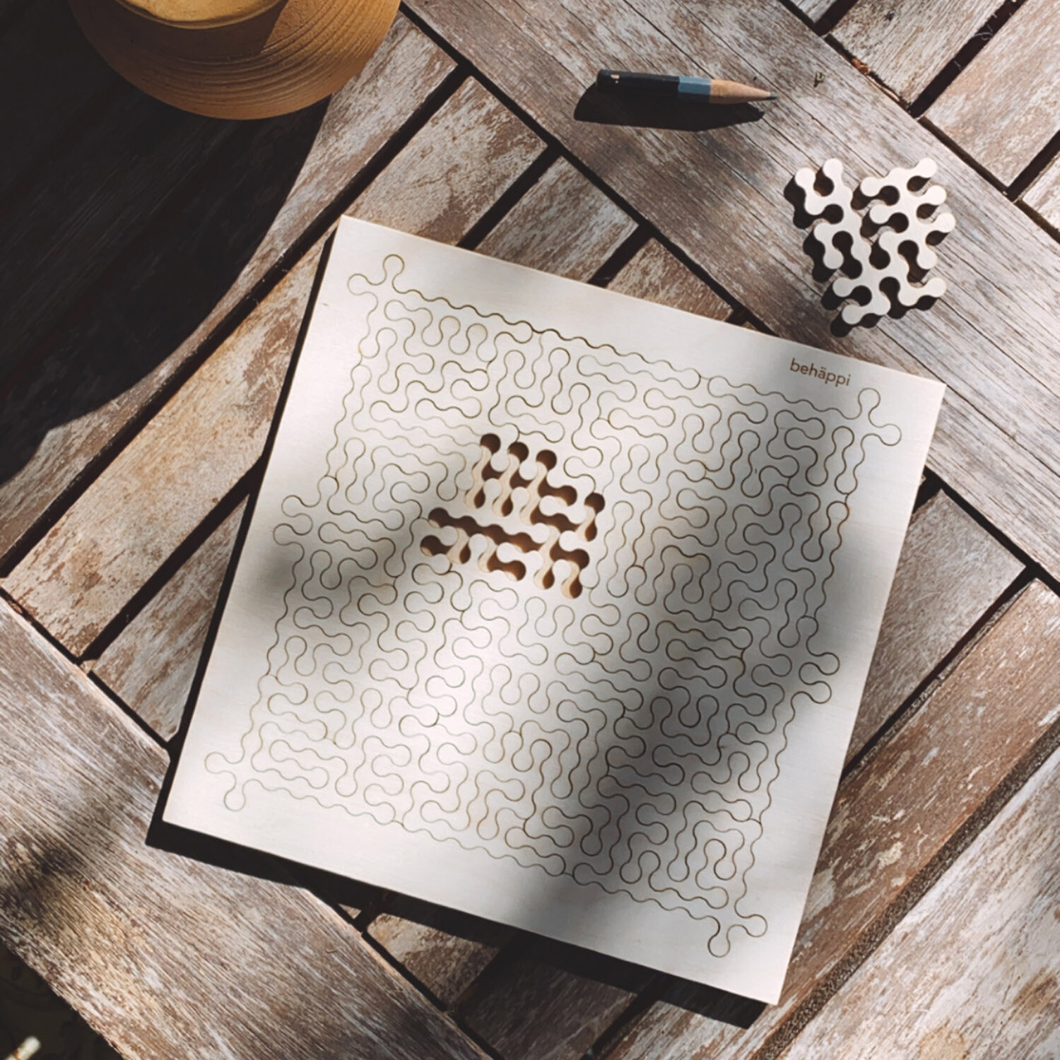 Stimulate your brain and free your mind from daily stresses with the Behäppi Hoop puzzle. This beautiful, tactile wood puzzle is handcrafted to challenge your mind and inspire some creative thinking with interconnected geometric shapes and patterns. Every element has its own place and no gaps between pieces are allowed. As an added challenge, the back of each piece is the same as the front, so you never know which side is correct.