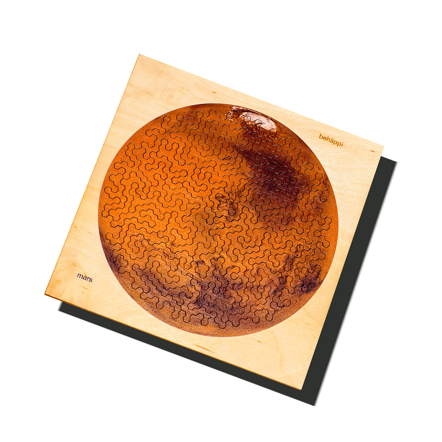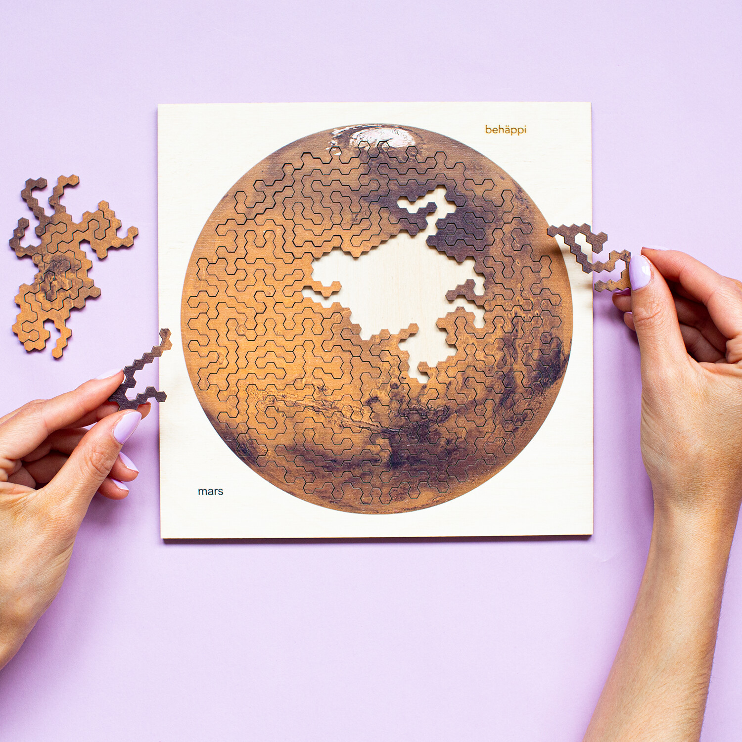 Stimulate your brain and free your mind from daily stresses with a Behäppi puzzle. This beautiful, tactile, 49 piece wood puzzle is handcrafted to challenge your mind and inspire some creative thinking with interconnected geometric pieces that combine to form an image of Mars in absolutely stunning clarity. The image, courtesy of NASA, is one of the clearest images of the planet to date. Every element has its own place and no gaps between pieces are allowed. As an added challenge, the back of each piece is the same as the front, so you never know which side is correct.