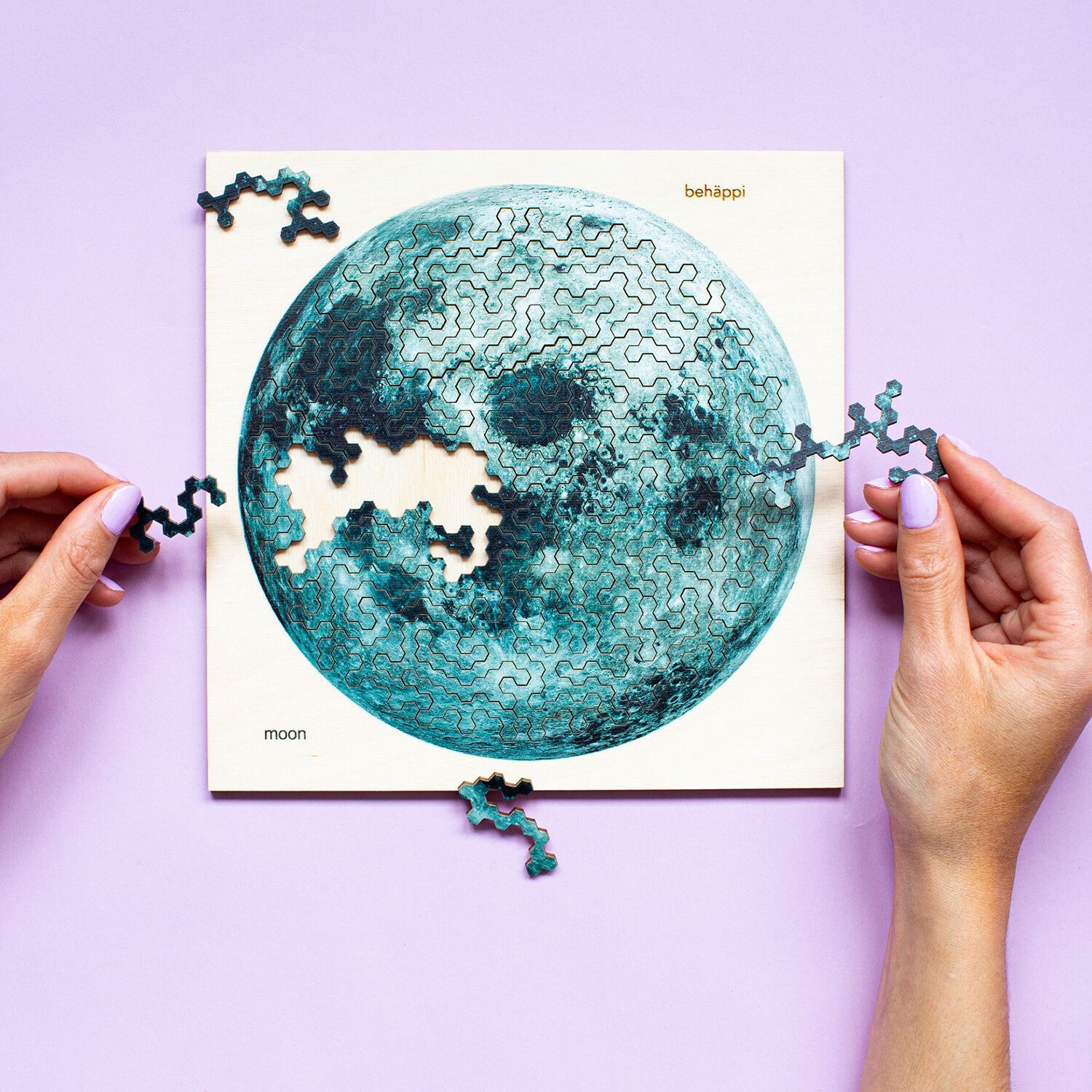 Stimulate your brain and free your mind from daily stresses with a Behäppi puzzle. This beautiful, tactile, 49 piece wood puzzle is handcrafted to challenge your mind and inspire some creative thinking with interconnected geometric pieces that combine to form an image of the Moon in absolutely stunning clarity. The image, courtesy of NASA, is one of the clearest images of the Moon to date. Every element has its own place and no gaps between pieces are allowed. As an added challenge, the back of each piece is the same as the front, so you never know which side is correct.