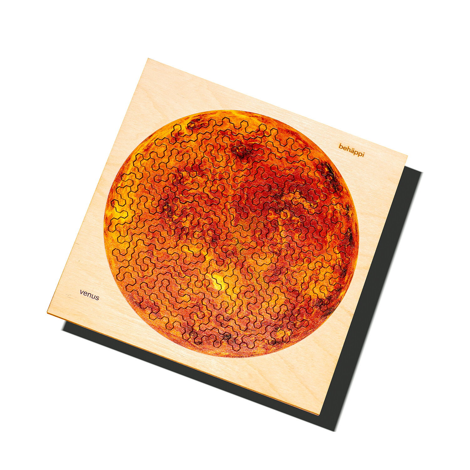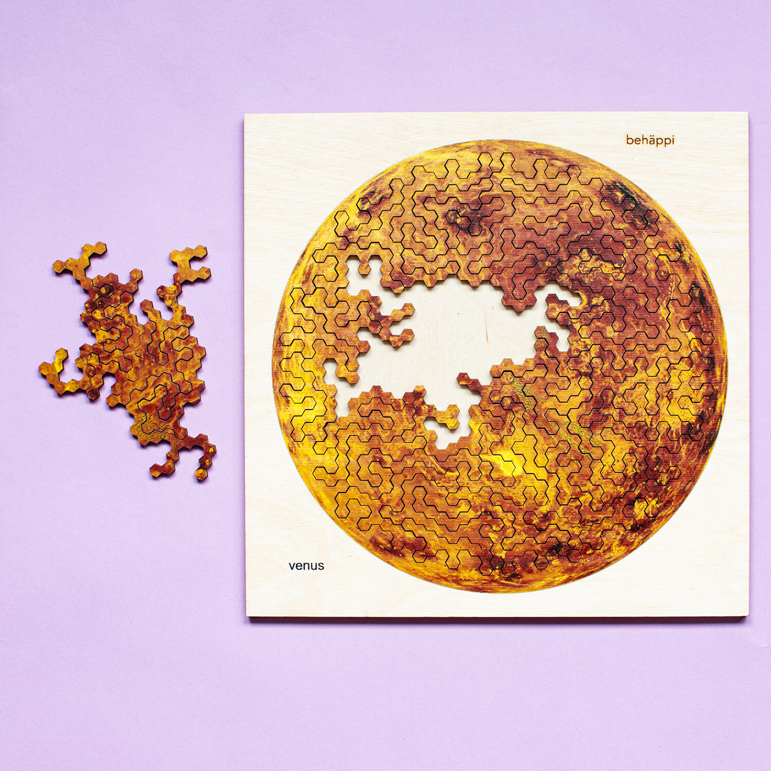 Stimulate your brain and free your mind from daily stresses with a Behäppi puzzle. This beautiful, tactile, 49 piece wood puzzle is handcrafted to challenge your mind and inspire some creative thinking with interconnected geometric pieces that combine to form an image of Venus in absolutely stunning clarity. The image, courtesy of NASA, is one of the clearest images of the planet to date. Every element has its own place and no gaps between pieces are allowed. As an added challenge, the back of each piece is the same as the front, so you never know which side is correct.