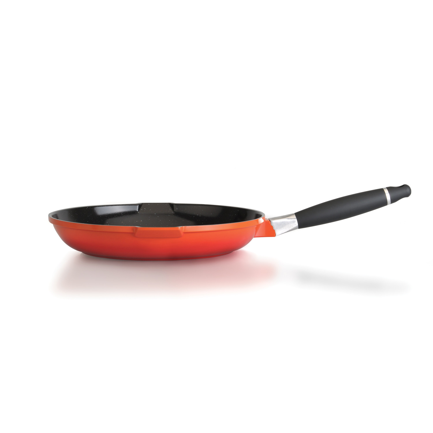 This 12" frying pan holds 3.7 quarts. The cast aluminum body allows for fast and equal heat distribution with a 3-layer Ferno ceramic coating making it non-stick, eco-friendly, and safe (PFOA and PTFE free).