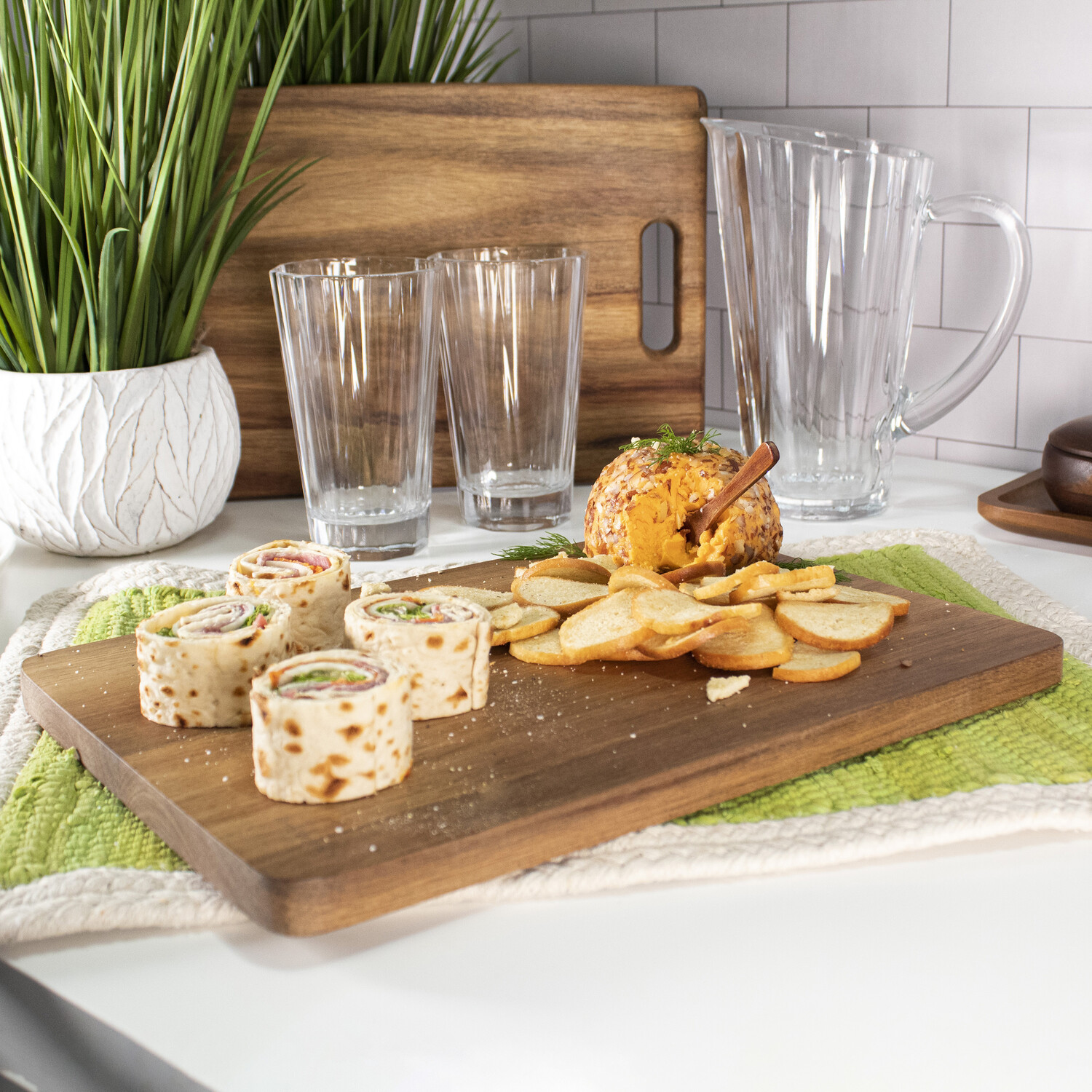 With unique beauty and grain, every board in this Acacia Wood 6pc Serving Set is different and extremely durable.The durable cutting surfaces with a rich, warm wood grain makes this a great choice for food prep. Store your spices in style! With this acacia wood spice jar set, your spices will make a statement on any table. Can be used with or without the tray, the choice is up to you.