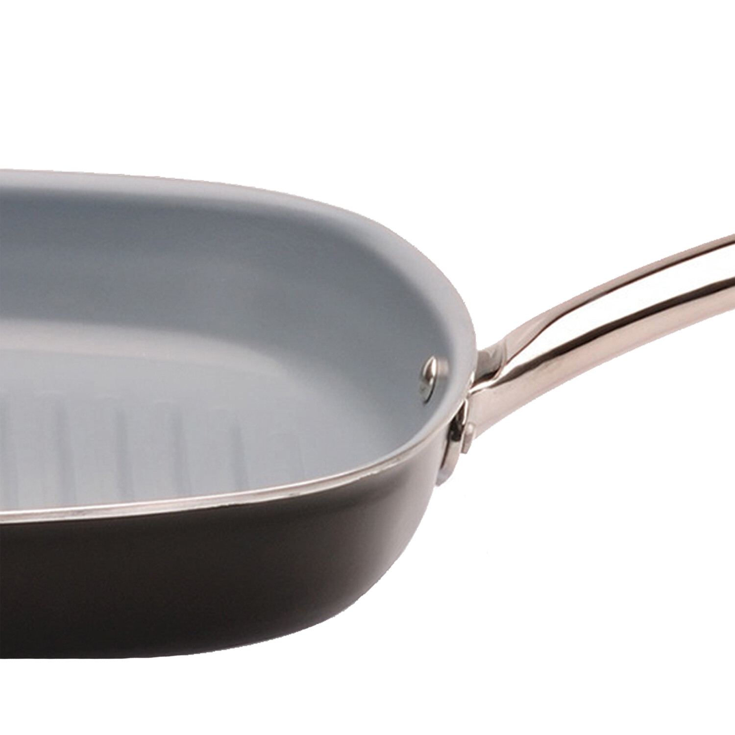 The Montane Earthchef Non-Stick Square Grill Pan features ceramic non-stick coating that is naturally 6 times stronger than any traditional non-stick coating. Does not contain toxic or hazardous materials. Has practical pouring rim to make draining and pouring off liquids easy. Hollow cast stainless steel handle that stays cool for safe handling. Made of 3 mm aluminum for fast and even heat distribution.