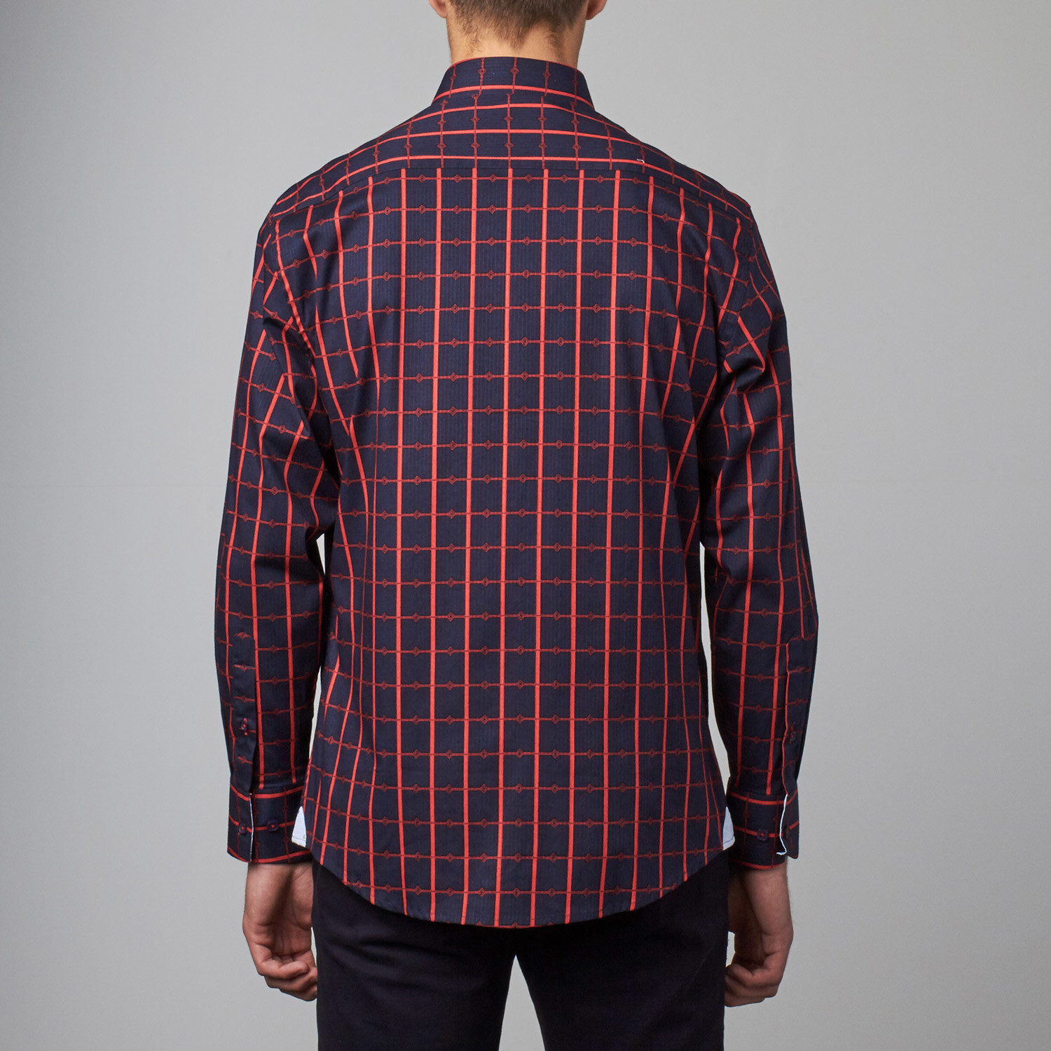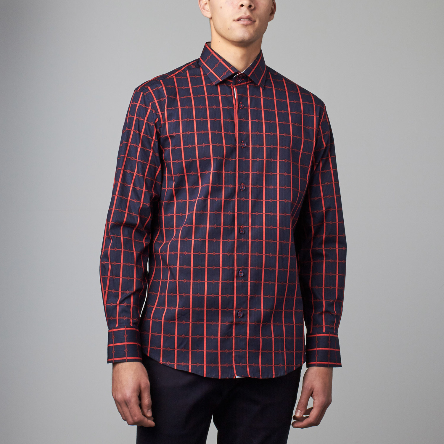Bespoke Moda // Long Sleeve Button Down Jacquard Shirt // Red + Blue Grid