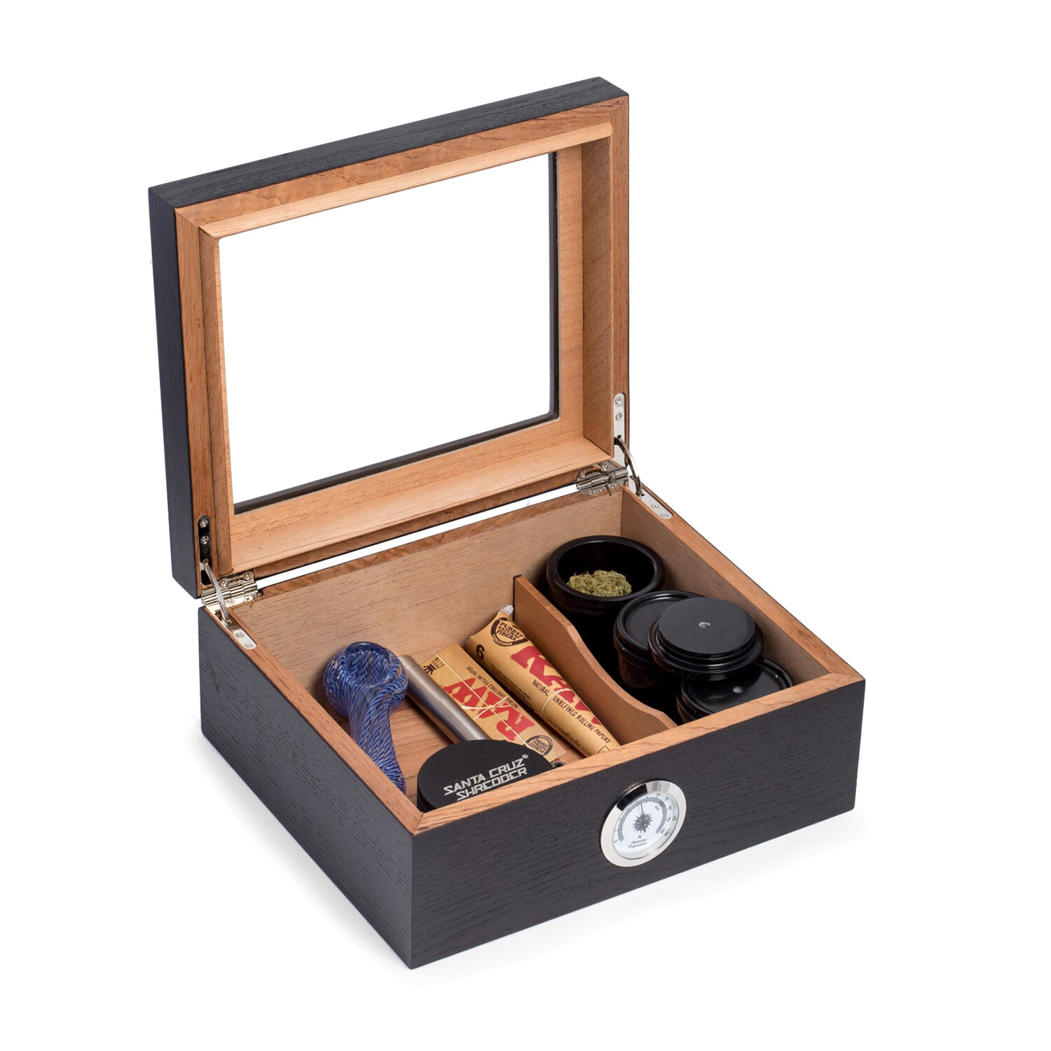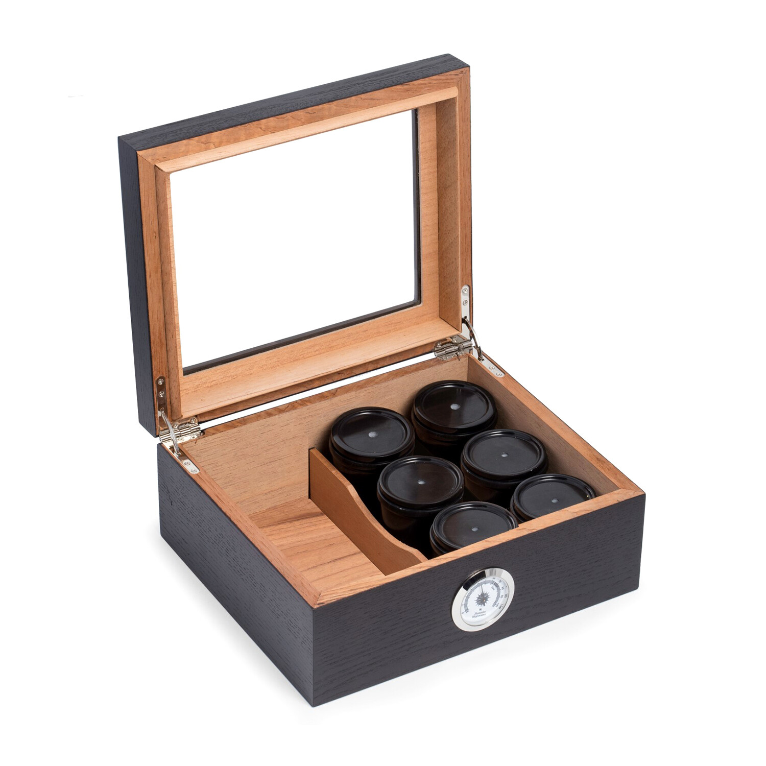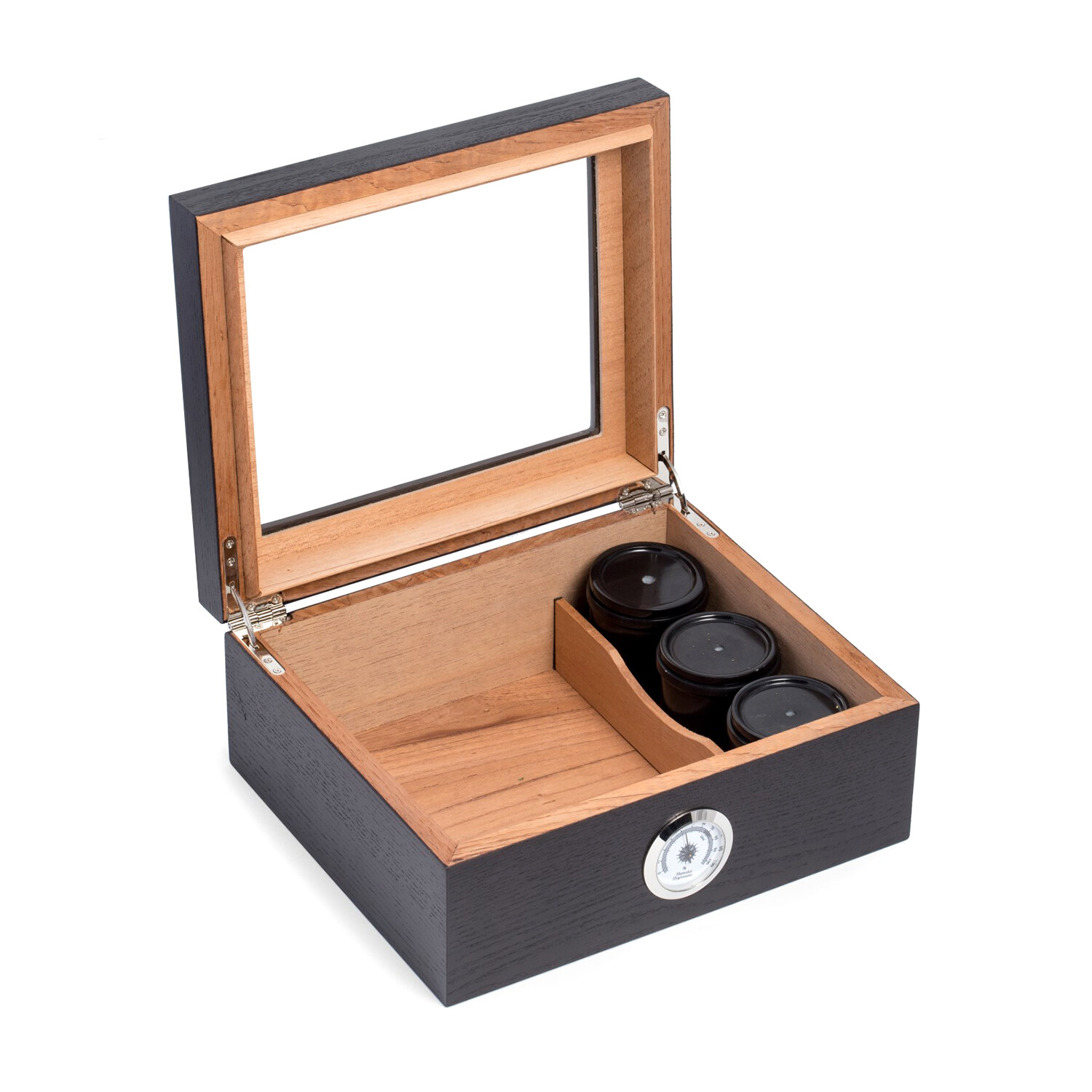 Cigar aficionados looking for the perfect sized modern Tobacco Humidor will find our 3-canister model is just the ticket. This humidor chest has a full high lacquer finish in a deep espresso color. It also induces a crystal clear glass top so you can easily see all your perfectly organized smoking items.