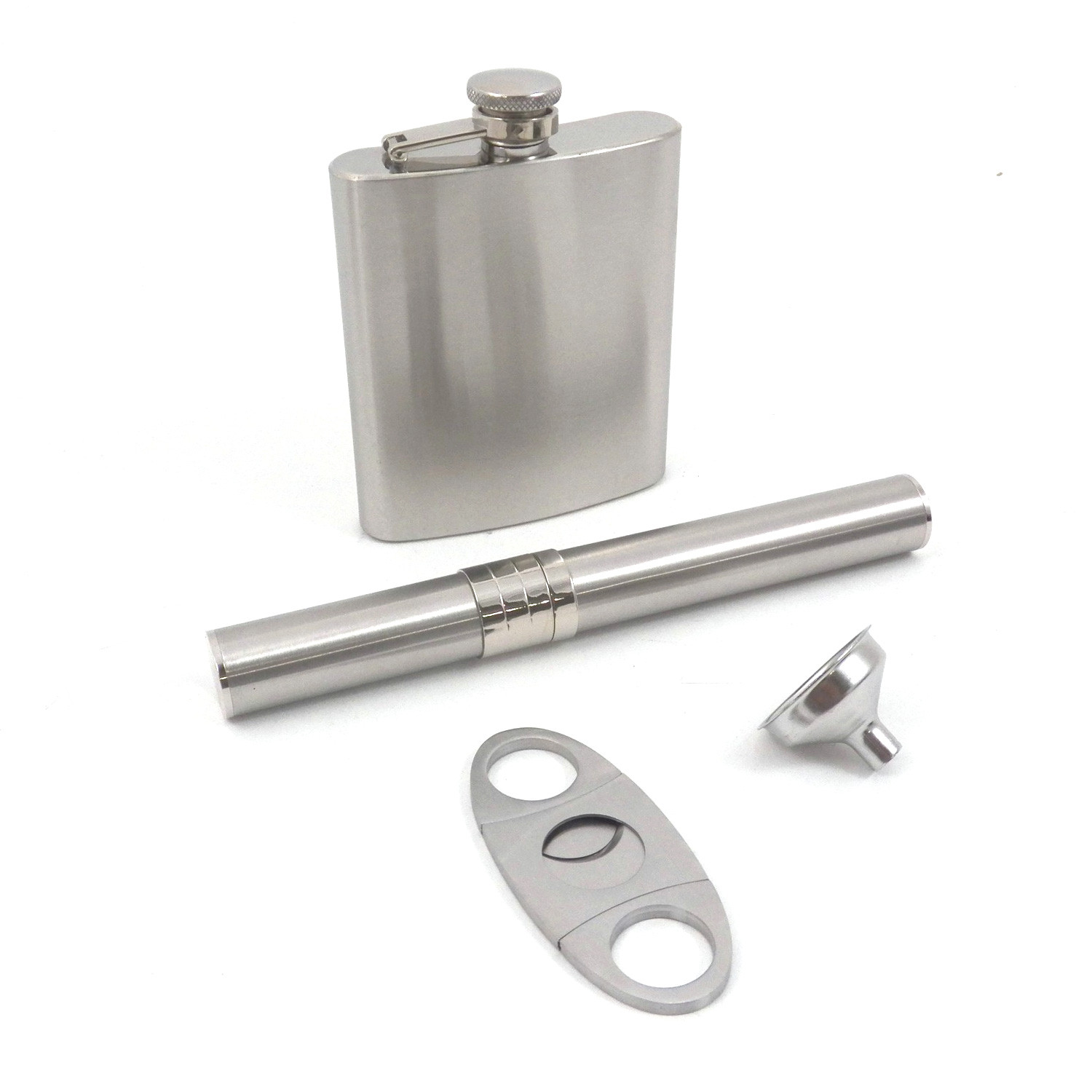 Bring the party with you everywhere with this four piece Flask Set. It's ideal for traveling, with a portable size that's finished perfectly in stainless steel. You never need be without your favorite drink or smoke ever again with this incredible double-guillotined cigar cutter, matching tube, funnel, and of course the flask.