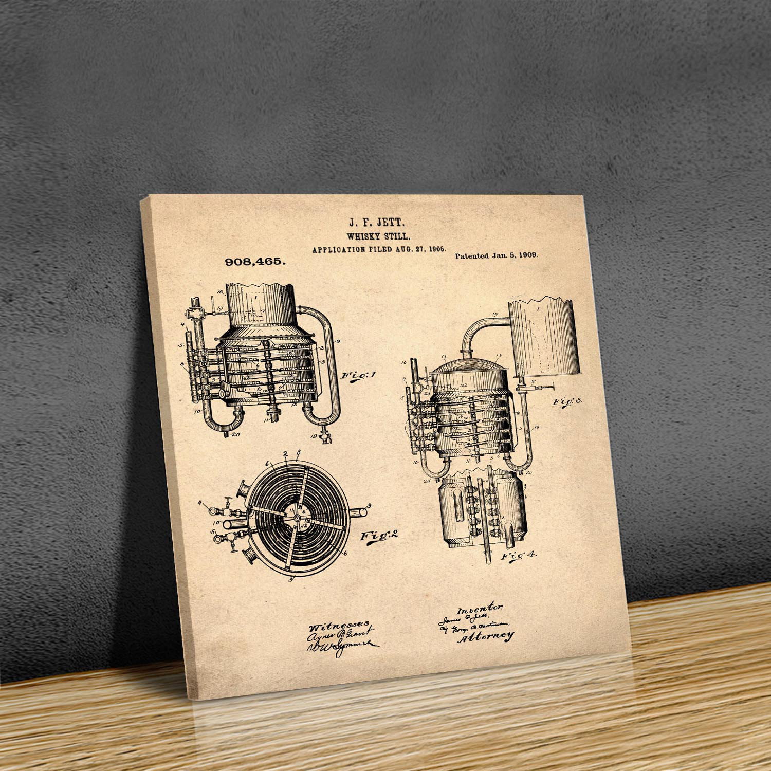 This specially curated collection of Bill Cannon's alcohol-related patent images has been faithfully reproduced on your choice of cotton stretched canvas or 275 gram fine art paper, using state-of-the-art digital printing. Each one features real, old-school patent designs of technology, gadgets, and processes involved in the creation and consumption of spirits, for a timeless, historical, and subtly fun piece of art that complements any decor.
