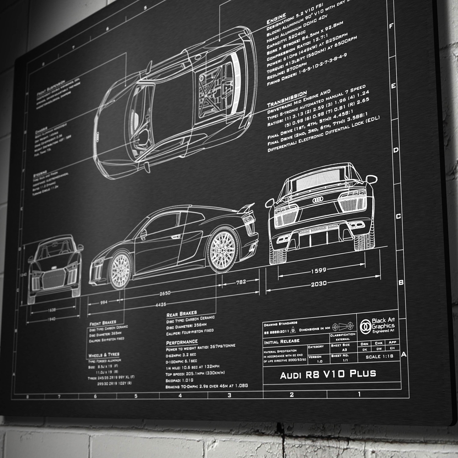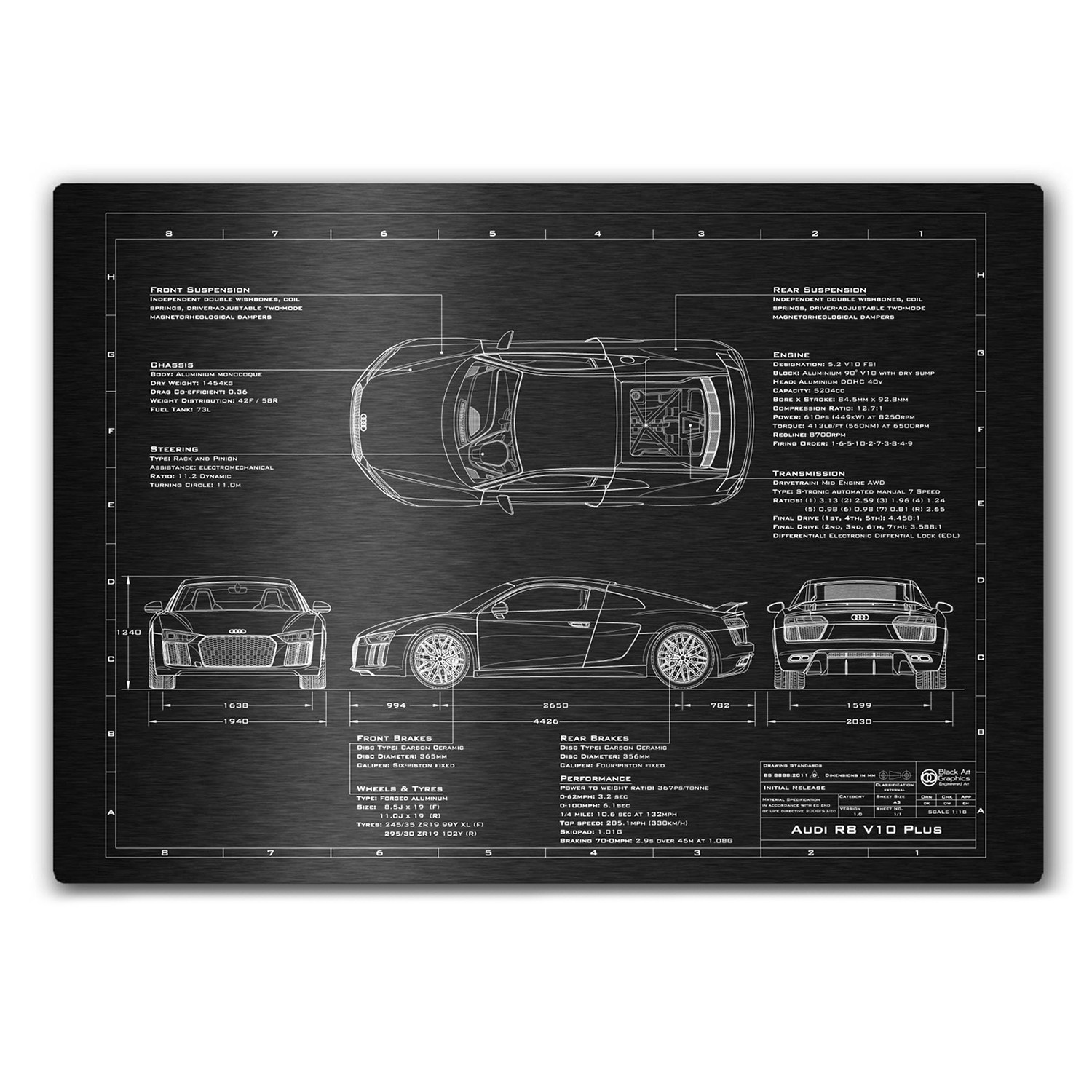 Celebrate your favorite iconic automobile in a totally unique way with this laser engraved anodized aluminum print. It features a high definition blueprint illustration, achieved from a unique photoshoot process to ensure accurate, realistic proportions.