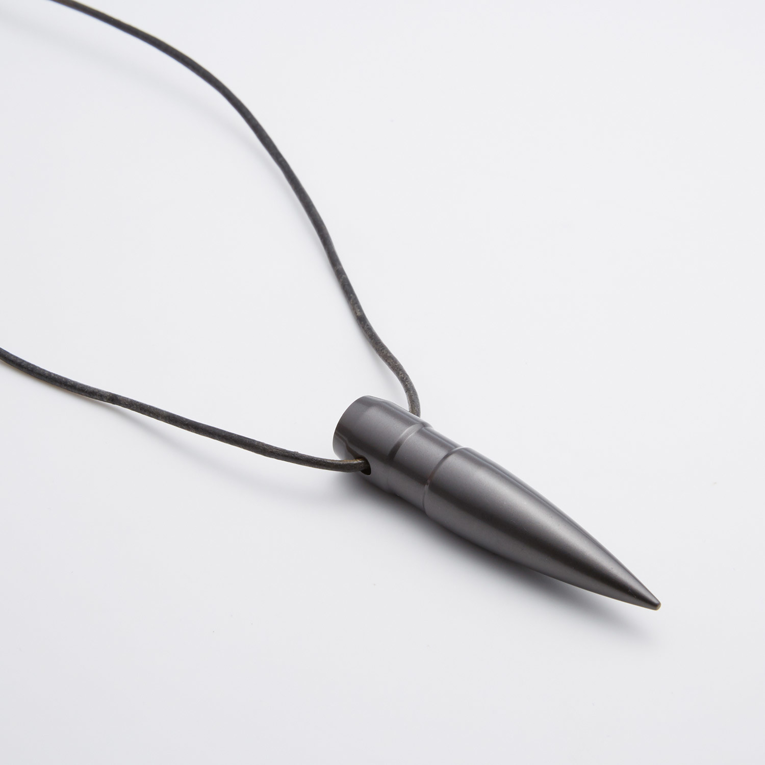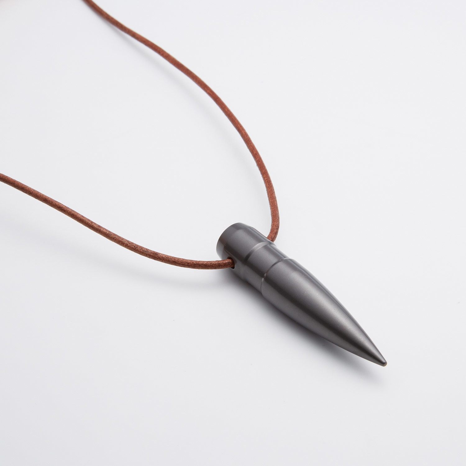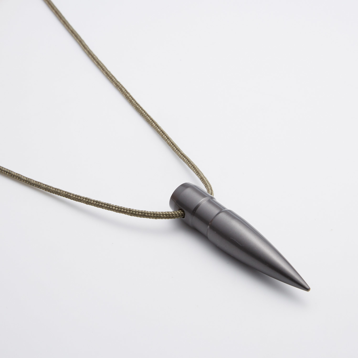 This .50 BMG bullet pendant, made of pure brass, wows audiences with its life size and superior craftsmanship. The pendant’s weight, look and feel are all those of a real bullet. This bullet pendant is made of high-end brass and was produced using CNC methods. It is then refined and polished by hand.