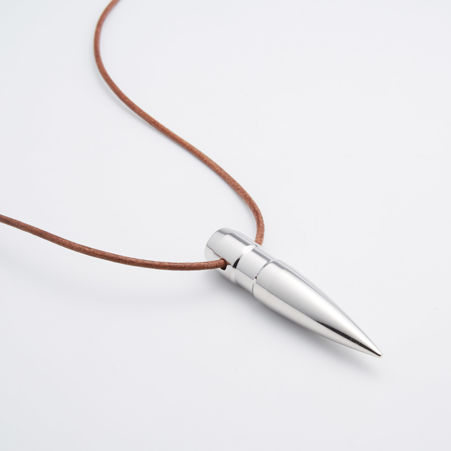 This .50 BMG bullet pendant, made of pure brass, wows audiences with its life size and superior craftsmanship. The pendant’s weight, look and feel are all those of a real bullet. This bullet pendant is made of high-end brass and was produced using CNC methods.