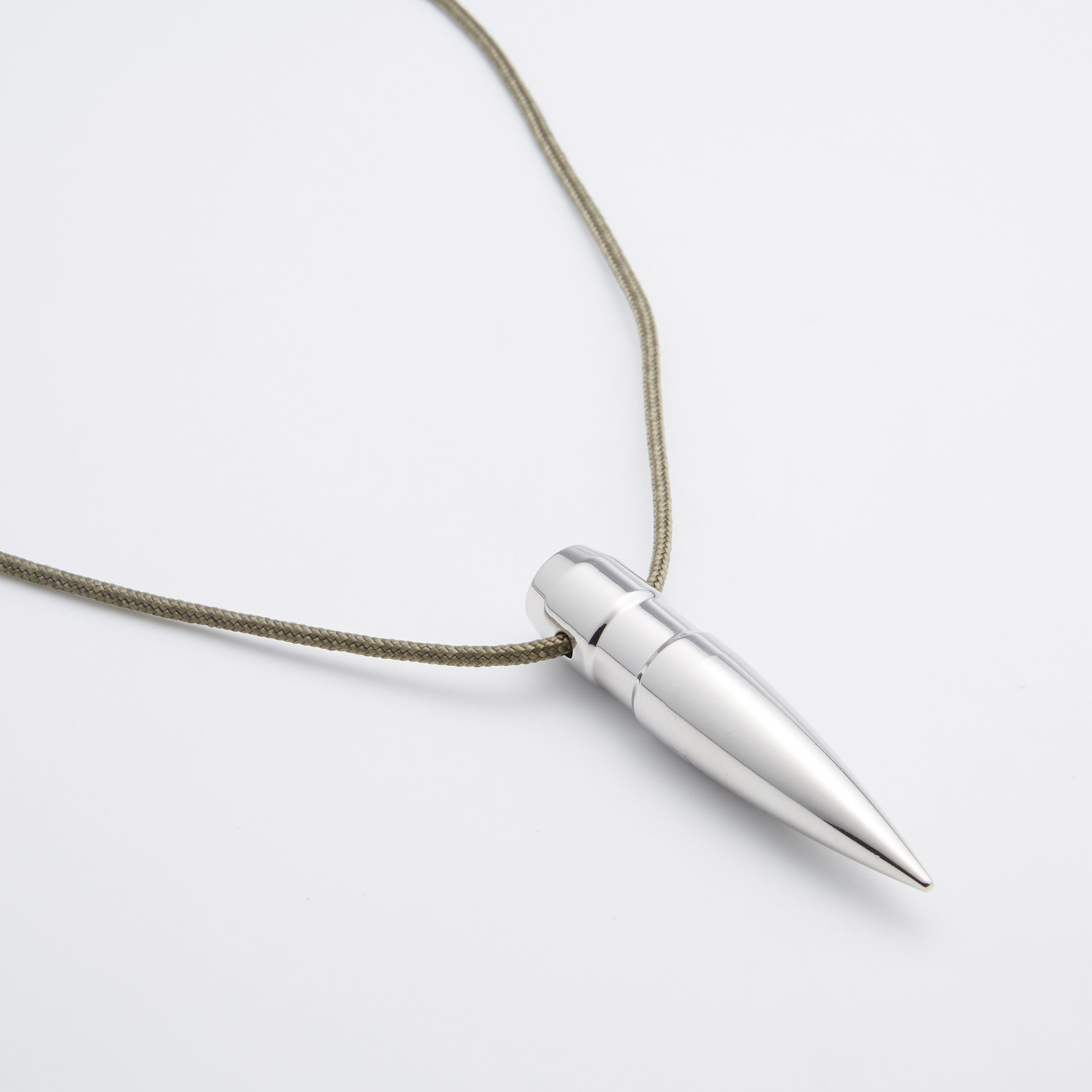 It is then refined and polished by hand. It has been lovingly plated with rhodium, meticulously refined by hand and polished to a high sheen. Rhodium is a precious metal that prevents tarnishing and gives the piece a high-end shine. The massive appearance of this pendant in the shape of a .50 BMG bullet is guaranteed to be a real eye-catcher.