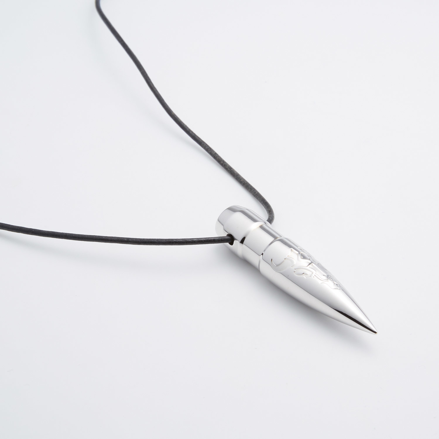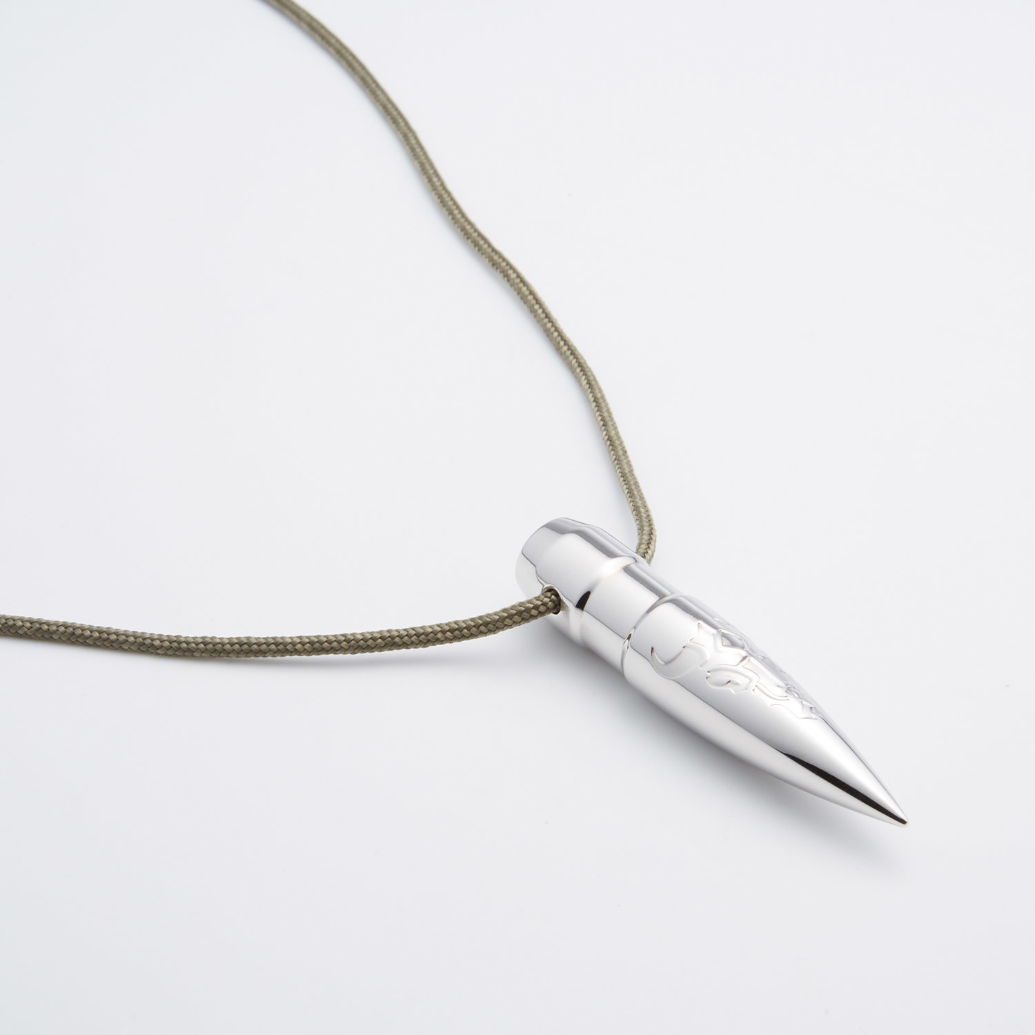 It has been lovingly plated with rhodium, meticulously refined by hand and polished to a high sheen. Rhodium is a precious metal that prevents tarnishing and gives the piece a high-end shine. The massive appearance of this pendant in the shape of a .50 BMG bullet is guaranteed to be a real eye-catcher.