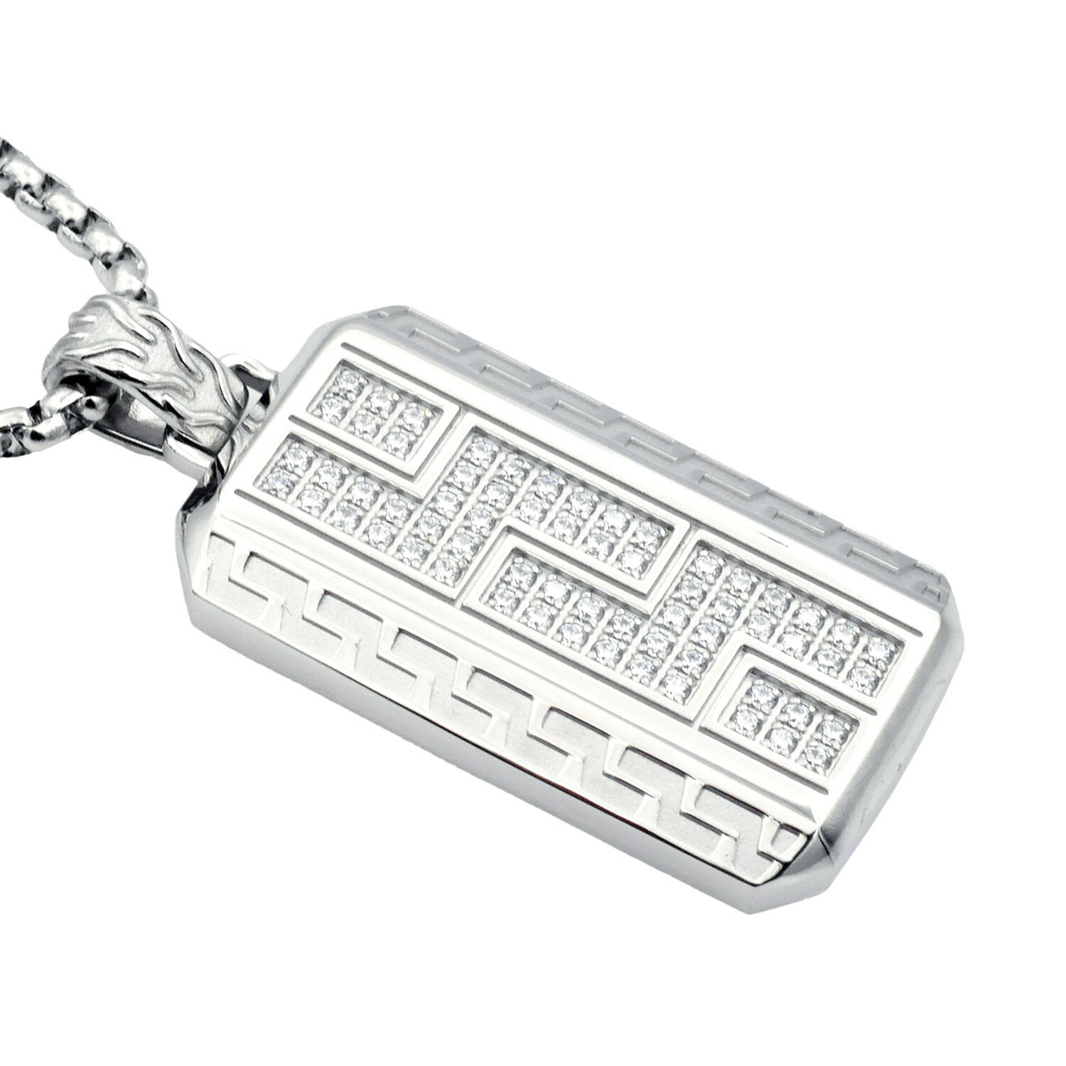 Brushed + Polished Stainless Steel Greek Key CZ Dog Tag Round Box Chain Necklace // 24"