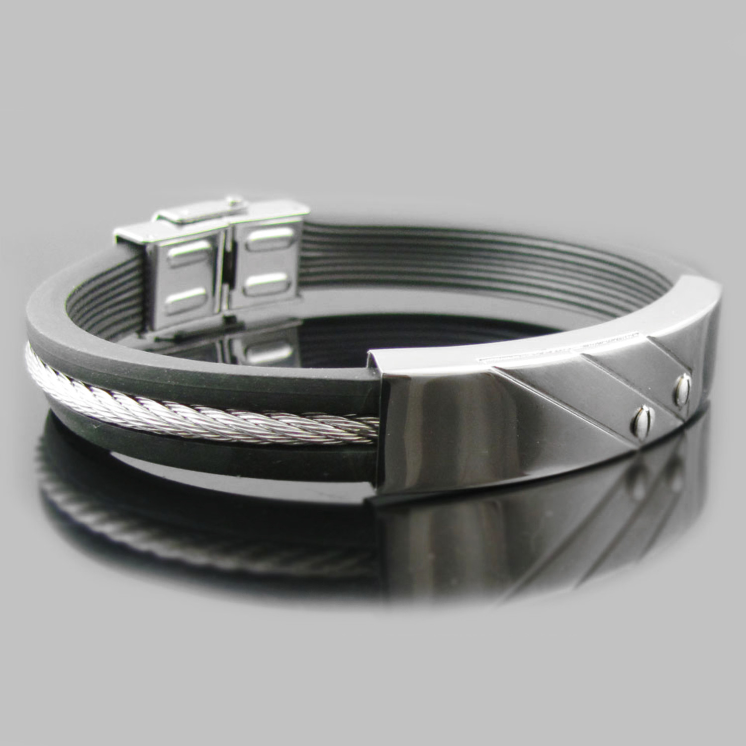 This Brushed & Polished Bangle is a rugged bangle with a bold mix of materials. Brushed and polished stainless steel have been brought together and the black rubber sets off a wire that adds an industrial edge.