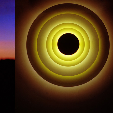 Concentric Cool is a uniquely shaped hardwired wall light in satin white by Rob Zinn for Blank Blank. For this design, colors were applied to the back of each layer so that it glows subtly in natural light when the fixture is off, but glows brightly when turned on.