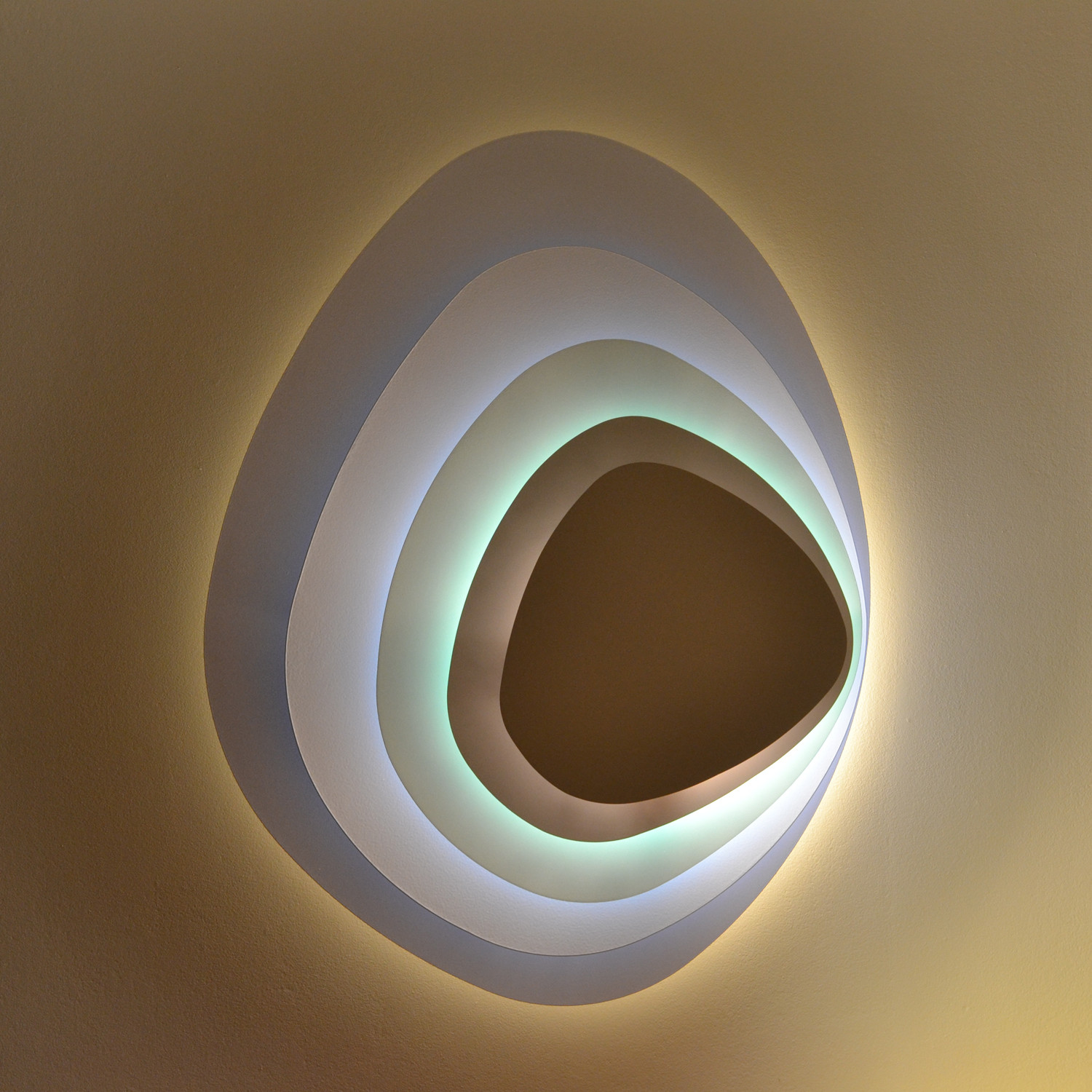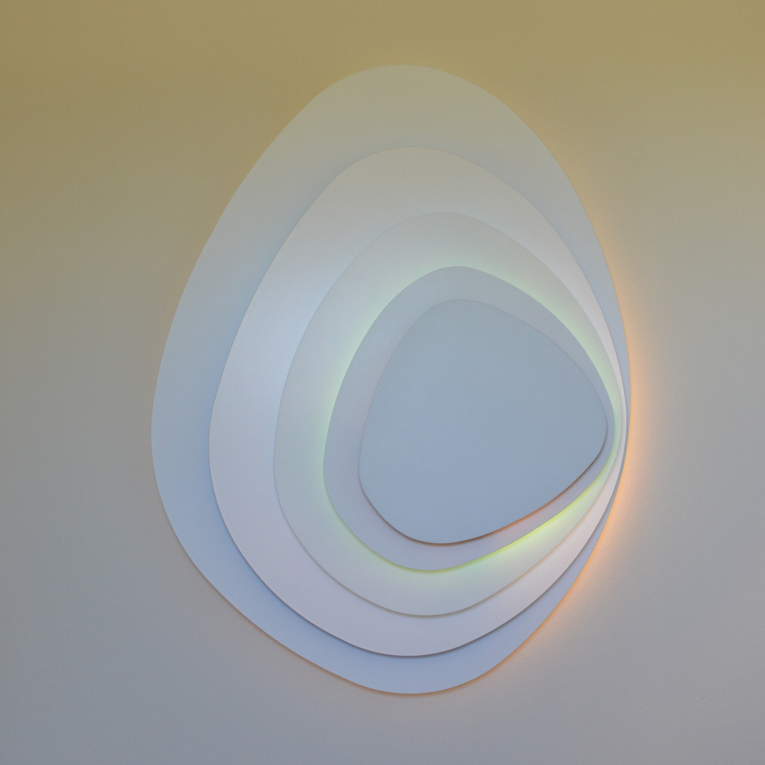 Expansion S is a uniquely shaped hardwired wall light in satin white by Rob Zinn for Blank Blank. For this design, colors were applied to the back of each layer so that it glows subtly in natural light when the fixture is off, but glows brightly when turned on.