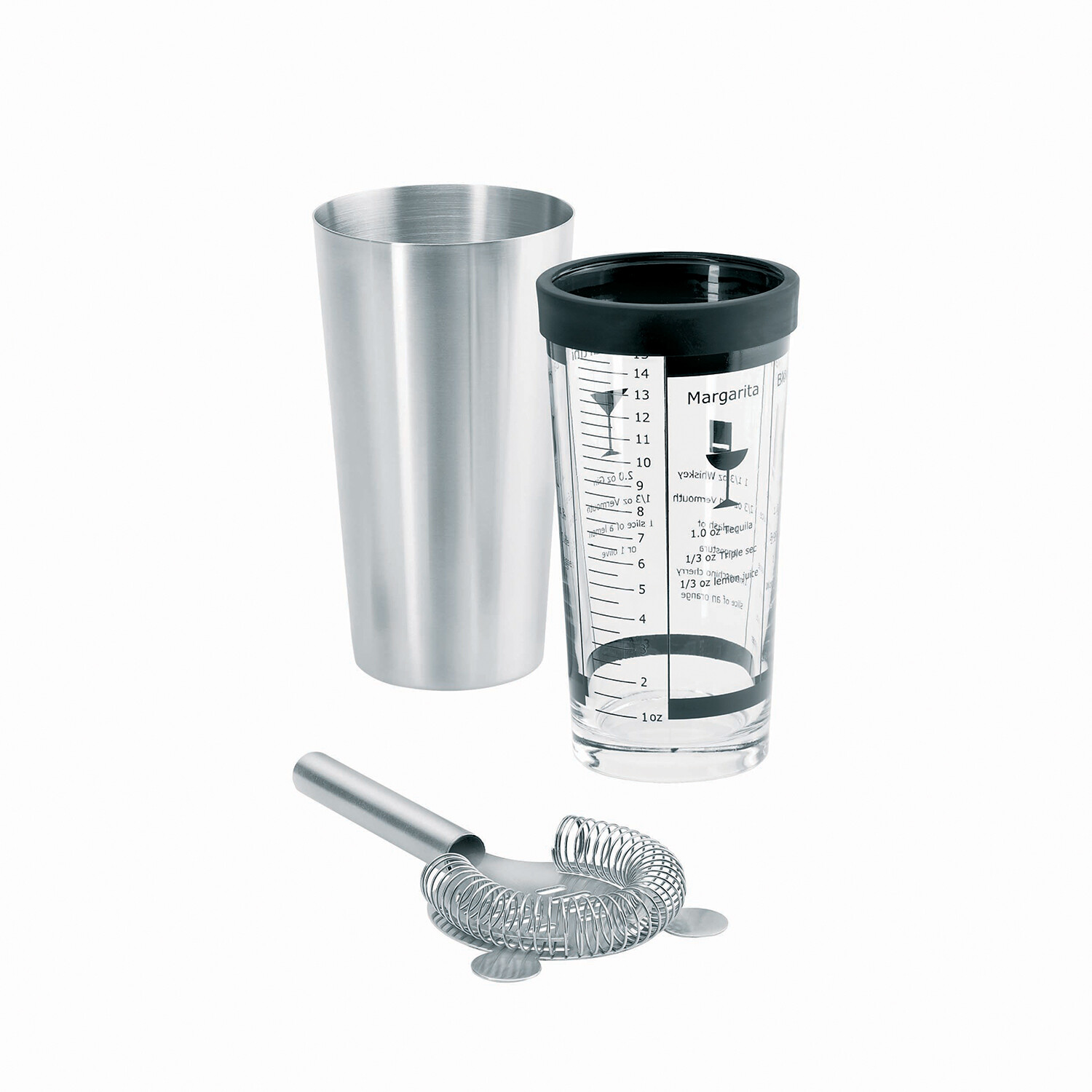 The blomus stainless steel boston cocktail shaker set includes measurements and recipes imprinted on the glass. Its rubber edge protects the glass when put together with stainless while shaking. Serve directly in glass or use the included strainer to pour. Perfect accessory for any bar, the glass shows several cocktail mixtures and their exact dosage.