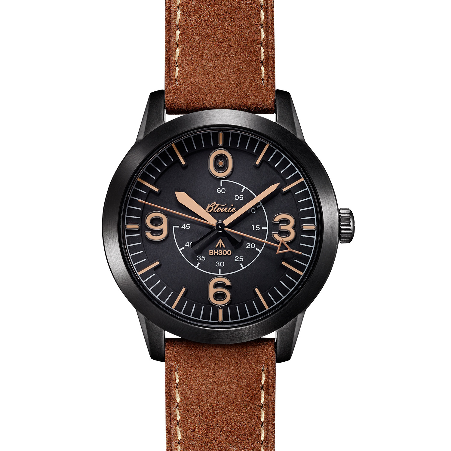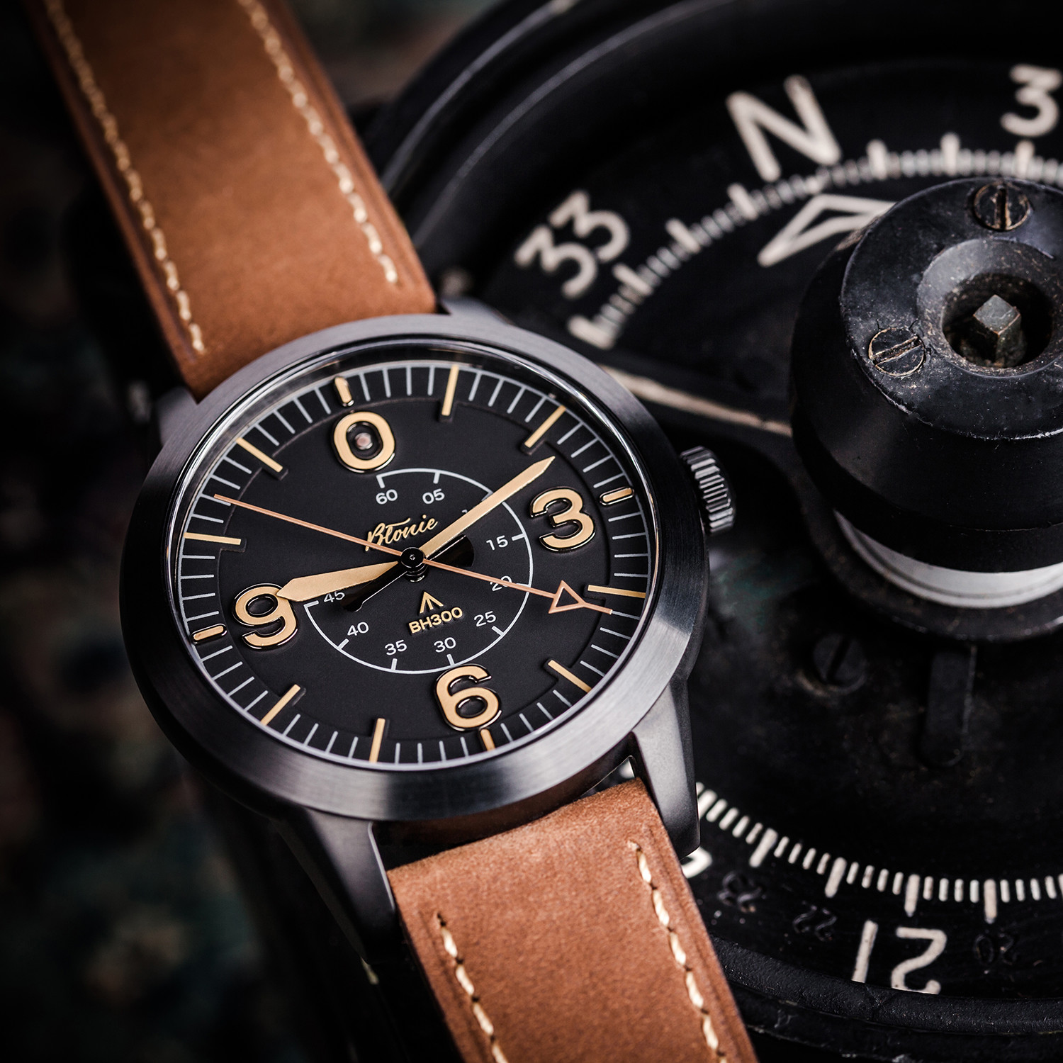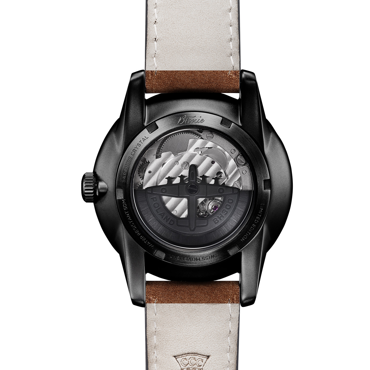 Classic and sophisticated, this Błonie Automatic features a precision Swiss movement with Geneva stripes and 24 jewels. The custom rotor in the shape of a Lancaster plane can be seen through the glass caseback.