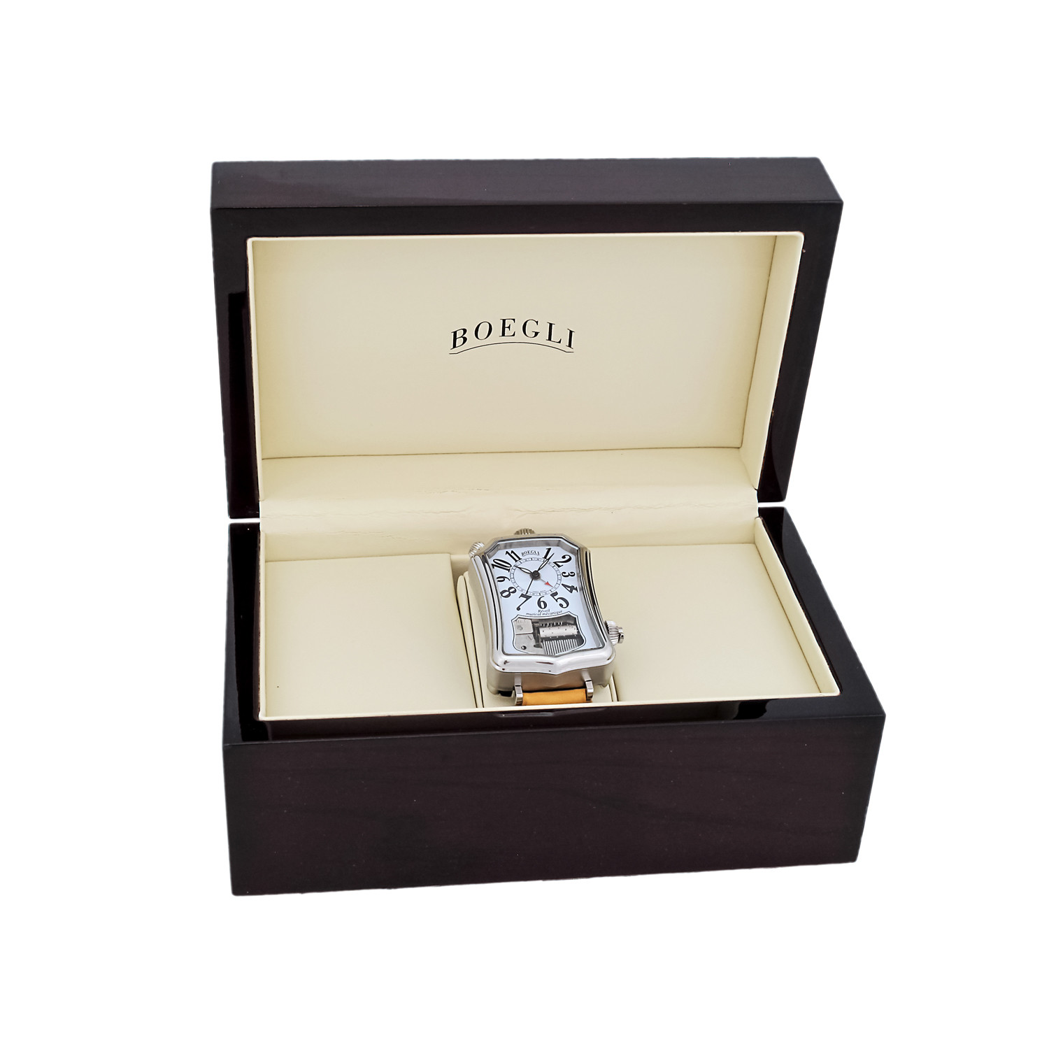 In fact, this watch consists of a automatic winding mechanism, and a fabulous mechanical musical movement. In this way, right at the time you desire, you will hear a soft tune that's just your type. The original shape of the case that resembles the contours of the opening on each Boegli dial, and the crown's subtle, folding lever allows you to wind the musical movement effortlessly.