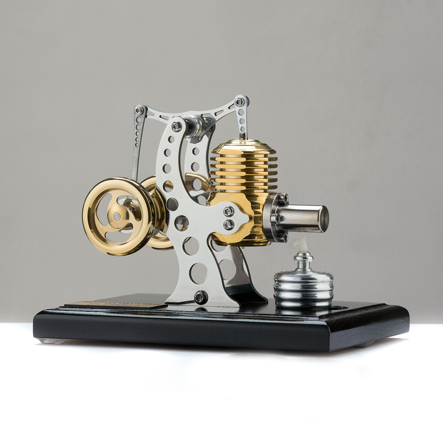 Patented in 1816 by Robert Stirling, the hot air engine or Stirling engine is based on a simple principle: A burner filled with fuel heats the air inside a cylinder and thereby purveys energy to the motor that activates through piecing of the flywheels.