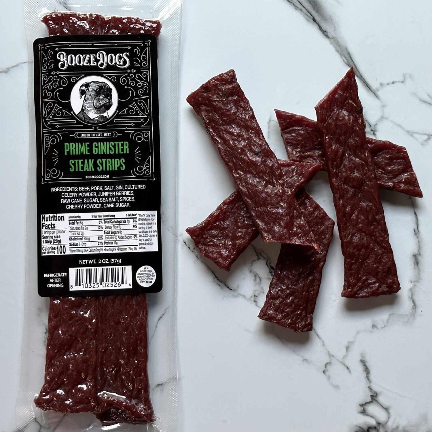 — Prime Gin-ister Jerky Strips: Beef, Pork, Salt, Gin, Cultured Celery Powder, Juniper Berries, Raw Cane Sugar, Sea Salt, Spices, Cherry Powder, Cane Sugar.